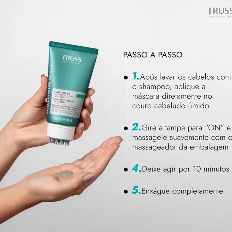 A Truss Máscara Couro Cabeludo Equilibrium Scalp HC 150g é um tratamento intensivo para quem busca equilibrar o couro cabeludo, especialmente em casos de oleosidade excessiva, descamação ou coceira. Ideal para cabelos mistos ou oleosos, esta máscara utiliza a Tecnologia Scalp Reboost para proporcionar uma ação calmante, purificante e refrescante, promovendo a saúde do couro cabeludo e hidratação equilibrada aos fios. Com fragrância fresca de Neroli, Bergamota e Flor de Laranjeira, transforma o cuidado capilar em uma experiência relaxante, oferecendo alívio imediato e cabelos revitalizados com brilho natural. Características: Marca: Truss Professional Linha: Equilibrium Scalp Categoria: Máscara Capilar Versão: HC (Home Care) Benefícios: Acalma o couro cabeludo, reduzindo coceira e irritações Controla a oleosidade excessiva Reduz descamação e promove renovação celular Hidrata os fios sem pesar Textura argilosa e fluida para fácil aplicação Ingredientes Principais: Salix Alba (extrato de casca de salgueiro): Purifica o couro cabeludo, reduz oleosidade e acalma irritações 4-Terpineol: Ação antisséptica e anti-inflamatória Tara: Encapsula ativos em um gel natural, liberando benefícios por até 24 horas Amla: Antioxidante e revitalizante Murta de Anis: Antioxidante e antimicrobiana Bio Balance Complex e Reviscalp: Ativos vegetais que combatem desordens capilares e regeneram a microbiota Modo de Aplicação: Após lavar os cabelos com o Shampoo Equilibrium Scalp, com os fios ainda molhados, gire a tampa da bisnaga para a posição ?ON? e aplique a máscara diretamente no couro cabeludo, utilizando o aplicador de silicone acoplado para realizar movimentos circulares suaves. Espalhe o produto por toda a região, massageando delicadamente. Deixe agir por 10 minutos e enxágue completamente. Feche o aplicador girando a tampa para ?OFF?. Para melhores resultados, use em conjunto com o shampoo e condicionador da linha Equilibrium Scalp. Benefícios do Produto: Eficácia: Alivia desconfortos como coceira e descamação, promovendo um couro cabeludo saudável e equilibrado desde a primeira aplicação. Durabilidade: A liberação sequencial de ativos garante ação contínua por até 24 horas, prolongando o controle da oleosidade. Versatilidade: Ideal para cabelos oleosos na raiz e secos nas pontas, podendo ser incorporada em rotinas de cuidados diários ou tratamentos intensivos. Design ou Praticidade: A embalagem de 150g com aplicador de silicone acoplado facilita a aplicação precisa e estimula o couro cabeludo, promovendo relaxamento. A Truss Máscara Couro Cabeludo Equilibrium Scalp HC 150g é a solução definitiva para quem deseja um couro cabeludo saudável e cabelos revitalizados. Com tecnologia avançada e ativos naturais, ela combina cuidado intensivo com uma experiência sensorial única, oferecendo alívio, hidratação e frescor. Perfeita para uso em casa ou no salão, esta máscara eleva o conceito de scalp care, trazendo inovação e bem-estar à sua rotina capilar.