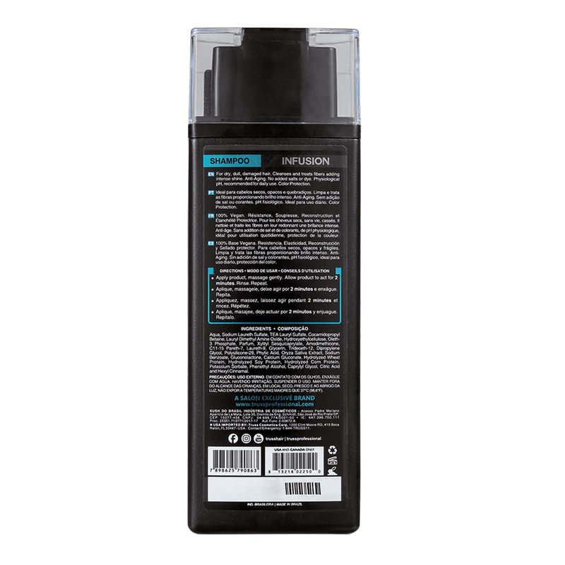 O Truss Infusion Shampoo é perfeito para quem busca uma limpeza eficaz e ao mesmo tempo delicada para os fios. Sua fórmula exclusiva, enriquecida com nutrientes e vitaminas, proporciona hidratação profunda enquanto remove impurezas e resíduos do dia a dia. Ideal para cabelos ressecados e danificados, esse shampoo revitaliza os fios, promovendo maciez, brilho e saúde aos cabelos, preparando-os para os próximos cuidados da sua rotina capilar. Características: Marca: Truss Linha: Infusion Categoria: Shampoo Volume: 300ml Indicação: Cabelos ressecados e danificados Ativos Principais: Vitaminas, nutrientes hidratantes Textura: Líquida Livre de: Parabenos, sulfatos e silicones Cruelty-Free: Sim Benefícios do Produto: Limpeza profunda sem agredir os fios. Hidratação e nutrição intensas para cabelos ressecados. Restaura a saúde e brilho natural dos cabelos. Prepara os fios para um tratamento eficaz com outros produtos da linha Truss. Modo de Aplicação: Aplique o Truss Infusion Shampoo nos cabelos molhados, massageie suavemente até formar espuma e enxágue bem. Repita o processo, se necessário. Para melhores resultados, utilize em conjunto com o condicionador e máscara da linha Truss Infusion. O Truss Infusion Shampoo oferece a limpeza ideal para cabelos danificados, deixando-os profundamente hidratados, macios e com brilho intenso. Perfeito para manter os fios saudáveis e restaurados.