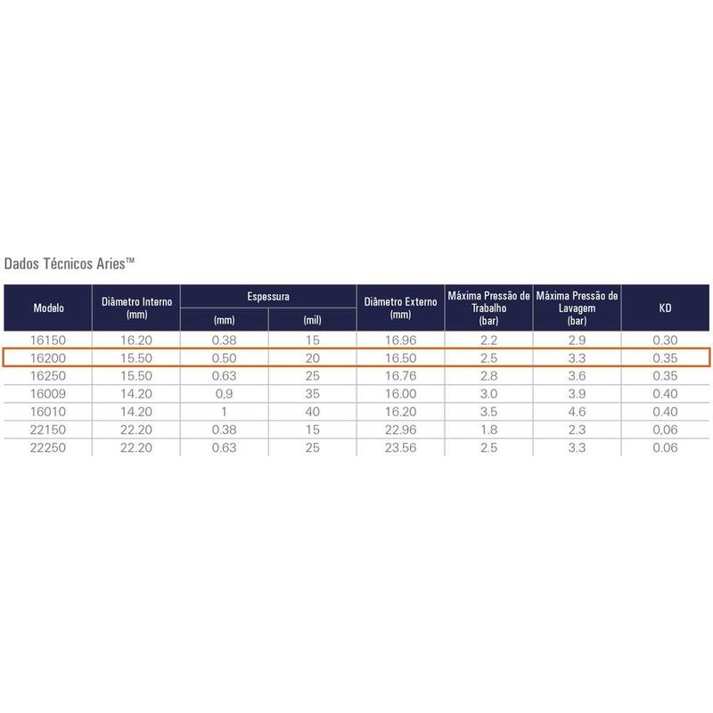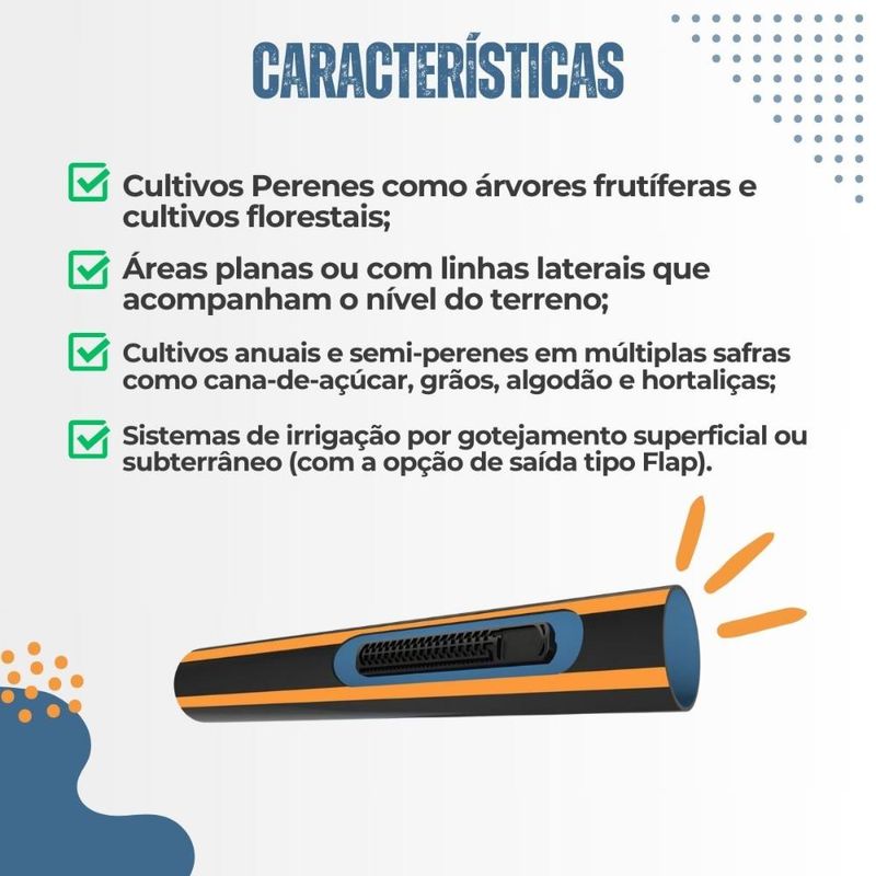Tubo gotejador Aries 16200 1,90 L/h 50 cm 900 metros – Netafim O tubo gotejador Aries 16200 da Netafim é ideal para sistemas de irrigação por gotejamento de baixa vazão e longa duração, oferecendo alto desempenho mesmo com águas de qualidade variável. A tecnologia exclusiva TurbuNext™ garante excelente resistência a entupimentos, prolongando a vida útil do sistema mesmo em múltiplas safras. Características técnicas: Vazão: 1,90 L/h Espaçamento entre emissores: 50 cm Comprimento da bobina: 900 m Diâmetro interno: 15,50 mm Diâmetro externo: 16,50 mm Espessura de parede: 0,50 mm (20 mil) Pressão máxima de trabalho: 2,5 bar Pressão máxima de lavagem: 3,3 bar Vantagens: Tecnologia TurbuNext™ com labirinto autolimpante, excelente contra entupimentos Alta robustez – ideal para cultivos contínuos e longa durabilidade Construído conforme as normas ISO 9261 e certificado pelo SII (Standard) Aplicações recomendadas: Cultivos anuais, semiperenes e perenes – hortaliças, cana-de-açúcar, algodão, frutíferas e florestais Sistemas de irrigação por gotejamento superficial ou subterrâneo (Flap opcional) Terrenos planos ou com linhas laterais niveladas ao relevo O Aries 16200 Netafim oferece precisão hidráulica, durabilidade superior e baixa manutenção, sendo a opção ideal para sistemas de irrigação exigentes e projetos agrícolas profissionais. Referência: 12930-002700