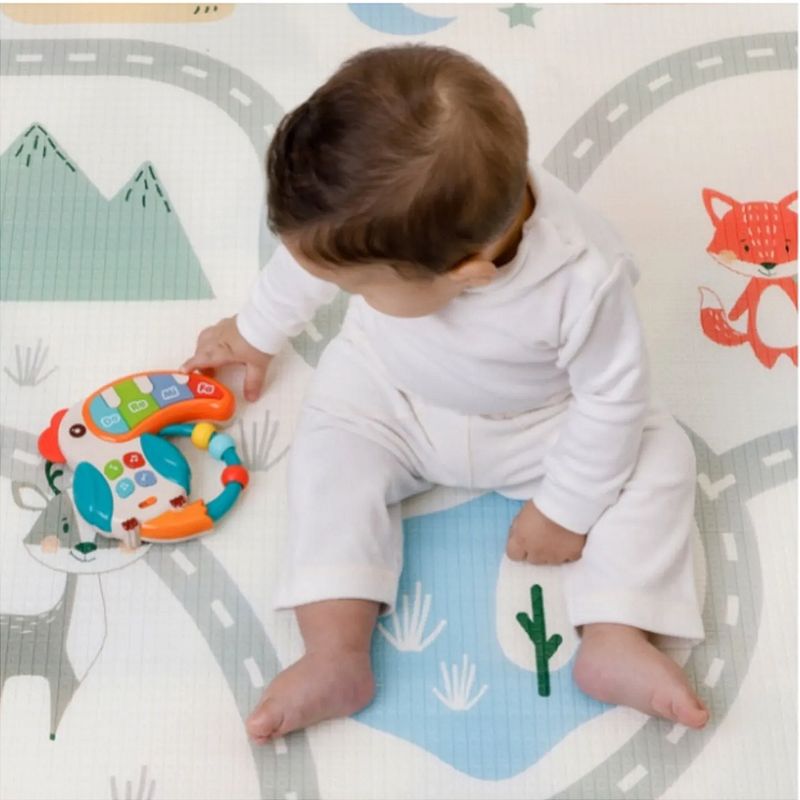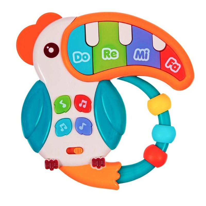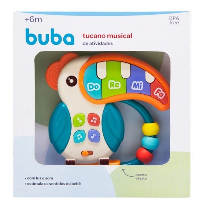 "Tucano Musical de Atividades - Buba O Tucano Musical de Atividades da Buba é superdivertido! Ao tocar as teclas, ele emite sons e musicas diversas. Para tornar a brincadeira ainda mais divertida, a luz do pianinho se acende e acompanha o ritmo dos sons. Com mordedor macio na crista, cores vibrantes e argolinhas interativas, é ideal para desenvolver os sentidos do bebê. Idade Recomendada3 Meses Produto 100% atóxico; Livre de BPA e Fitalatos; Contém: 1 Tucano musical e 2 Pilhas AAA; Composição mordedor: 100% Borracha Termoplástica (TPR); Composição teclas: 100% Poliestireno (PS); Composição partes laranjadas: 100% Acrilonitrila Butadieno Estireno (ABS); Composições demais partes: 100% Polipropileno (PP); Imagens meramente ilustrativas! Registro INMETRO: CE-BRI/INNAC 00110-13A"