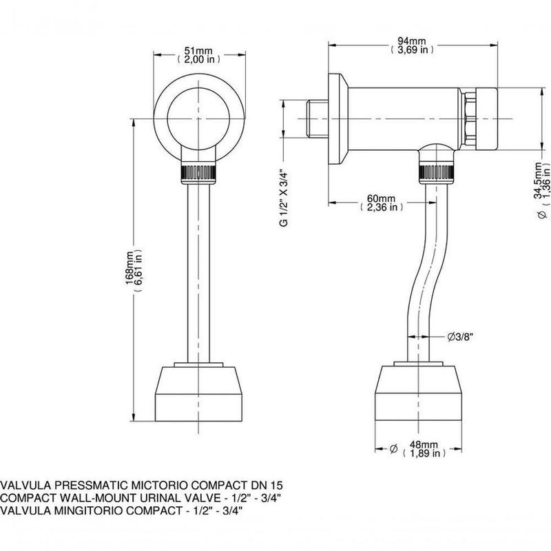 Válvula De Mictório Pressmatic Compact 1/2Principais Características:- As Válvulas de Mictório Pressmatic possuem um sistema de acionamento hidromecânico, com leve pressão da mão e fechamento automático temporizado em aproximadamente 6 segundos;- Esse sistema é prático, o que garante elevada vida útil, resistência a depredações e maior higiene: uma vez acionado, o usuário não tem mais com o produto;- Seu acabamento de alta durabilidade e maior resistência à corrosão conserva a beleza dos produtos por muito mais tempo.Especificações:Peso 600 gCor CromadoConteúdo Unitário Bitola 1/2 e 3/4Pressão Máxima 0,2 a 4 kgf/cm² ou 3 a 57 psiMaterial MetalAltura 20 cmLargura cmComprimento cmPeso Bruto kg