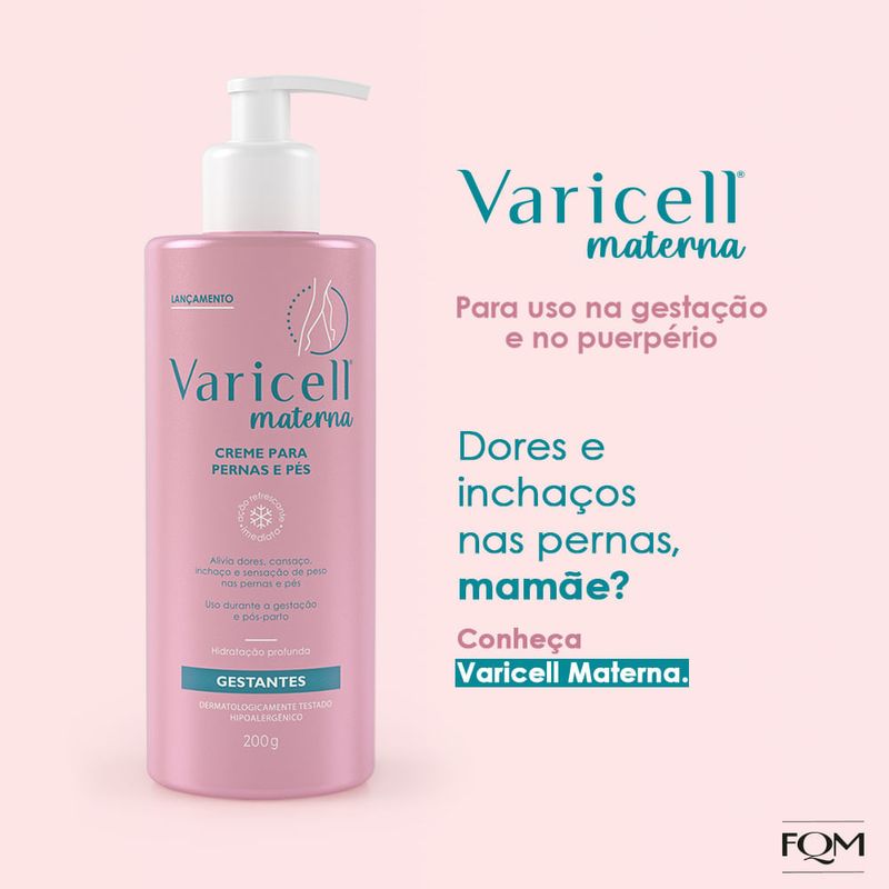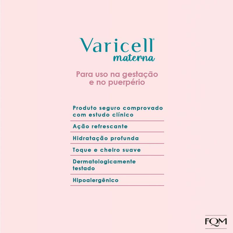 O que é e para que serve o Varicell® Materna? O Varicell® Materna é o aliado perfeito para gestantes que desejam aliviar o desconforto nas pernas e pés durante a gravidez. Com uma fórmula especialmente desenvolvida para essa fase, ele reduz a sensação de cansaço e peso, oferecendo um efeito refrescante imediato e hidratando profundamente a pele. Dermatologicamente testado, hipoalergênico e com eficácia comprovada por estudos clínicos, o Varicell® Materna pode ser usado com segurança tanto durante a gestação quanto no pós-parto, ajudando as mamães a cuidarem de si mesmas com tranquilidade. Benefícios e Diferenciais Especialmente formulado para gestantes.Alívio rápido do cansaço e peso nas pernas.Indicado para uso durante a gravidez e no pós-parto.Comprovação de eficácia em estudos clínicos.Hidratação profunda para a pele sensível das mamães.Sensação refrescante com toque e fragrância suaves.Produto dermatologicamente testado e hipoalergênico. Como Usar? Para resultados melhores, aplique duas vezes ao dia, de manhã e à noite. Massageie suavemente pernas e pés com movimentos ascendentes até que o creme seja completamente absorvido. O ideal é aplicar após o banho, aproveitando a rotina diária de cuidados. Ingredientes Ativos O Varicell® Materna combina ingredientes poderosos e naturais para um cuidado eficaz: Castanha-da-Índia: Estimula a circulação e alivia o desconforto.Centella Asiática: Melhora a elasticidade da pele.Calêndula: Hidrata e acalma.Mentol: Proporciona frescor imediato. Composição Extrato de Aesculus hippocastanum, água, butil-hidroxitolueno, manteiga de Butyrospermum parkii, extrato de Calendula officinalis, caprililglicol, extrato de Centella asiática, olivato de cetearila, álcool cetílico, dimeticona, edetato dissódico, dodecano, isononanoato de etilexila, etilexilglicerina, polietilenoglicol-26 éter de glicerina, glicerol, mentol, oxalato de mentil etilamido, perfume, pentilenoglicol, caprilato de poliglicerila-3, poliacrilato de sódio e olivato de sorbitana. Cuidados e Advertências Não aplique em pele irritada ou lesionada.Evite contato com os olhos. Caso isso ocorra, lave com água abundante.Mantenha fora do alcance de crianças.Suspenda o uso em caso de irritação e consulte um médico.O Varicell® Materna é cuidadosamente formulado para minimizar o risco de alergias, oferecendo a segurança que as mamães precisam nesse momento tão especial. Perguntas Frequentes Varicell® Materna funciona? É bom?Sim, Varicell® Materna funciona e é uma ótima opção para gestantes que buscam alívio da sensação de cansaço e peso das pernas e pés durante a gravidez. Sua fórmula eficaz, clinicamente comprovada, hidrata profundamente e oferece uma ação refrescante instantânea. Varicell® Materna tem bula?Não, Varicell® Materna não possui bula, pois não é um medicamento, mas sim um dermocosmético. Você pode conferir todos os detalhes de como usar, composição e contraindicações na embalagem do produto.
