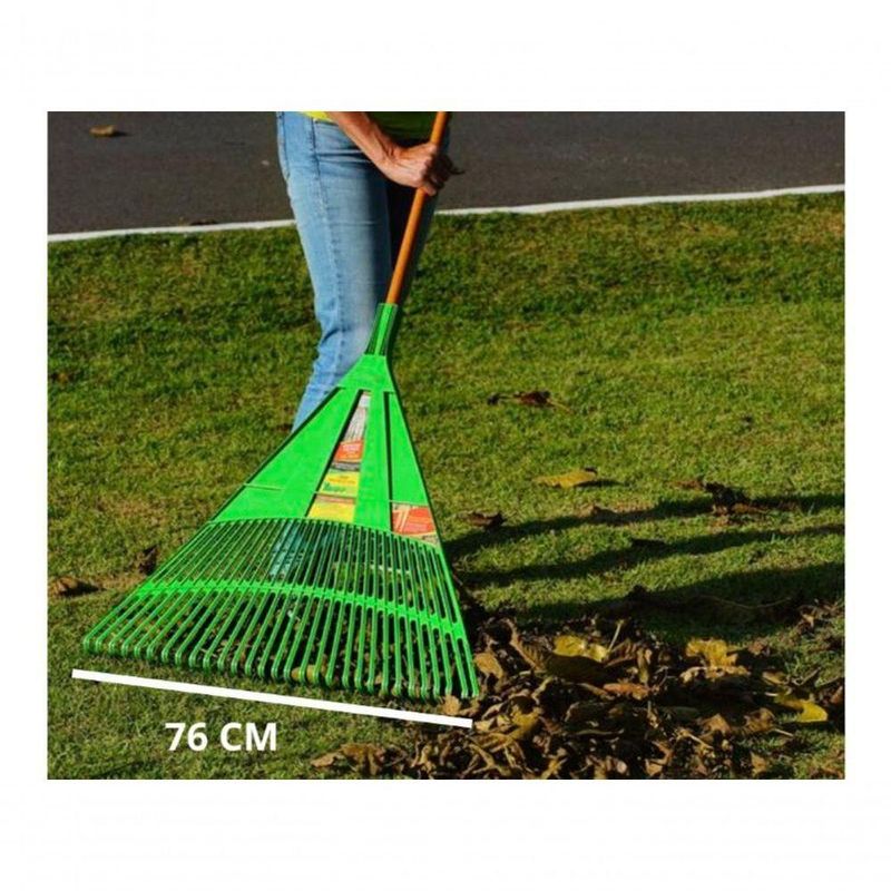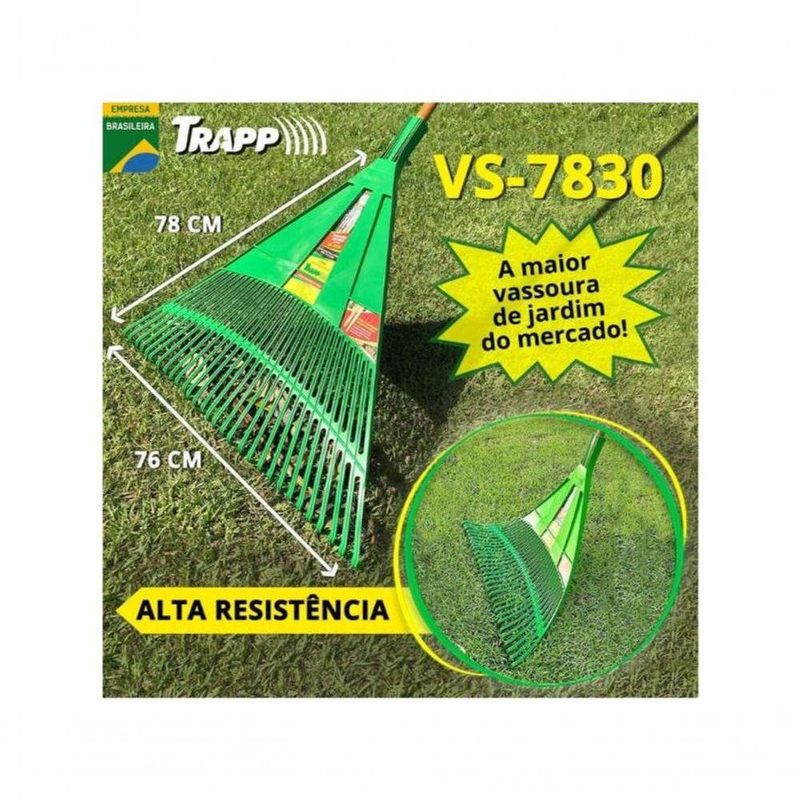 Vassoura Rastelo Ancinho Extra Grande Trapp Vs7830 JardimA Vassoura Ancinho Verde com Cabo Trapp VS 7830 é a ferramenta ideal para quem busca eficiência e praticidade na limpeza de áreas externas.Fabricada com plástico virgem, este produto garante maior resistência e durabilidade, tornando-se um aliado indispensável para o seu dia a dia.Com 30 palhetas e uma largura de 78 cm, ela proporciona um amplo campo de atuação, facilitando a tarefa de varrer e recolher grama e folhas de maneira rápida e eficaz.A cor verde não só confere um visual agradável, mas também destaca a qualidade da marca Trapp.Este item novo inclui um cabo, que proporciona conforto e ergonomia durante o uso.A Vassoura Ancinho VS 7830 é perfeita para manter seu jardim ou quintal sempre limpos e organizados, tornando suas atividades de limpeza muito mais simples e eficientes.CARACTERÍSTICAS E DIFERENCIAISVassoura com:78 cm de largura,30 dentes,rendimento em dobro.Faixa de abrangência: 76 cm.AplicaçãoIdeal para varrer e recolher grama e folhas.
