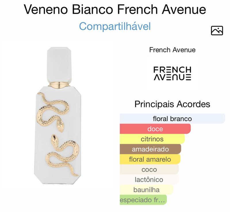FRENCH AVENUE Veneno Bianco de French Avenue é um perfume Floral Compartilhável. Esta é uma nova fragrância. Veneno Bianco foi lançada em 2025. As notas de topo são: Bergamota, Néroli e Leite. As notas de coração são: Ylang Ylang, Tiaré e Flores Brancas. As notas de fundo são: Coco, Madeira Guaiac, Baunilha e Ládano. Compartilhar