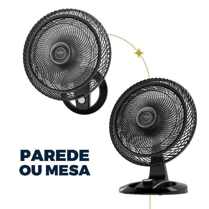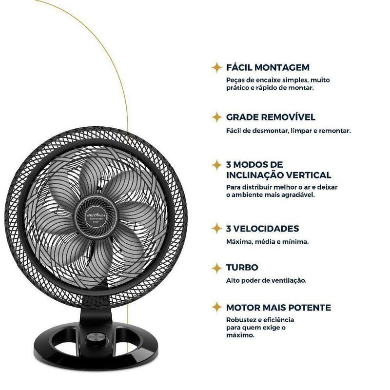 Ventilador 2 em 1 Britânia Maxx Force 8 Pás 230W BVT50T 220VO Ventilador 2 em 1 Britânia Maxx Force 8 Pás 230W BVT50T é ideal para quem busca alto desempenho e conforto térmico em qualquer ambiente. Com 230W de potência e tecnologia Maxx Force, proporciona ventilação intensa e eficiente. Sua hélice de 8 pás com 48 cm garante maior vazão de ar e melhor distribuição.Pensado para se adaptar à sua rotina, o Ventilador Britânia conta com 3 velocidades (suave, moderada e intensa) permitindo ajustar o fluxo de ar conforme a necessidade. O sistema 2 em 1 oferece versatilidade total, podendo ser utilizado como ventilador de mesa ou de parede. Uma solução prática para diferentes espaços.A grade removível de 57 cm facilita a montagem, desmontagem e limpeza, trazendo mais comodidade no dia a dia. Além disso, o Ventilador BVT50T possui oscilação horizontal automática e três opções de inclinação vertical, garantindo melhor direcionamento do ar no ambiente.Com classificação energética A, o Ventilador 2 em 1 Britânia alia potência e economia. O motor com fusível térmico de segurança, o porta-fio e a alça na grade traseira reforçam a praticidade e a segurança durante o uso. Eficiência, flexibilidade e conforto em um só produto: Ventilador 2 em 1 Britânia Maxx Force 8 Pás 230W BVT50T. Hélice de 8 pás com 48 cmTecnologia Maxx ForcePotência de 230W3 velocidades: suave, moderada e intensa2 em 1: uso como ventilador de mesa ou paredeGrade removível de 57 cmOscilação horizontal automáticaArticulação vertical com três níveis de inclinaçãoClassificação energética AMotor com fusível térmico de segurançaPorta-fioAlça traseira para transporte.Especificações Técnicas:Marca: BritâniaModelo: BVT50TCor da Estrutura: PretoCor das Pás: CinzaQuantidade de pás: 8Tipo de alimentação: Energia ElétricaPotência (W): 230WTipo: De parede De mesaDiâmetro (cm): 57Função repelente: NãoMaterial das Pás: PlásticoEstado: NovoAltura do produto: 70,5 cmLargura do produto: 57 cmComprimento do produto:40 cmPeso do produto: 5,146 kgAltura com embalagem: 73,1 cmLargura com embalagem: 27 cmComprimento com embalagem: 19,8 cmPeso com embalagem: 5,942 kgGarantia (Dias): 360Observação: Somente faturamos para o nosso consumidor final, ou seja, não faturamos pedidos para CNPJ por este portal de vendas;