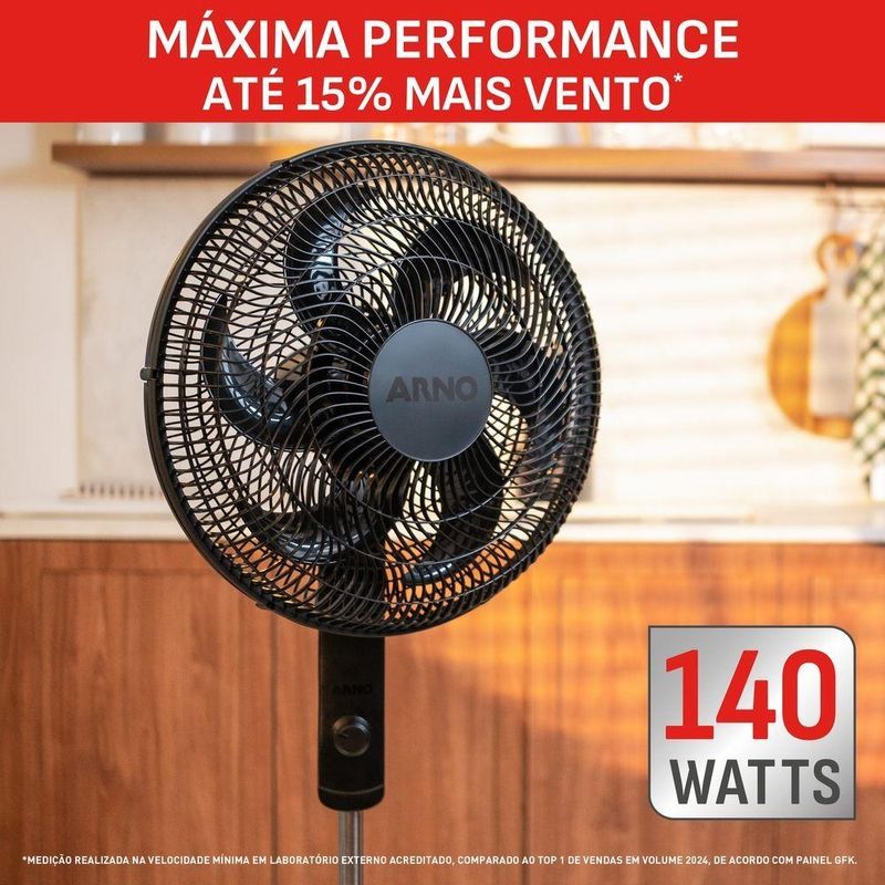 Conforto garantido com ventilação ajustável e distribuição uniforme do arO Ventilador Arno Essential VE2C foi desenvolvido para proporcionar conforto e praticidade no dia a dia. Com 40 cm de diâmetro e 6 pás, oferece um fluxo de ar eficiente, ideal para diferentes ambientes. Possui 3 velocidades que permitem ajustar a intensidade conforme a necessidade, além de oscilação horizontal de 80° e inclinação regulável, garantindo melhor direcionamento do vento.Com potência de 140W e design compacto, combina desempenho e funcionalidade. Sua estrutura leve facilita a movimentação, enquanto a base estável assegura segurança durante o uso.Um ventilador versátil que une potência e praticidade para refrescar qualquer ambiente.Especificações técnicasMarca: ArnoModelo: VE2CVoltagem: 220vPotência: 140W Cor: PretoTipo: ColunaVelocidade: 3Quantidade de Pás: 6Oscilação: Horizontal 80ºInclinação Regulável: SimClassificação Energética: BConsumo de energia: 3,88kWh/mês*Diâmetro da Hélice: 40cmDiâmetro da Grade: 49cmDimensões sem Embalagem: 48,5 L x 114 A x 48,5 P cmDimensões com Embalagem: 48,5 L x 28 A x 49,5 P cmPeso sem Embalagem: 4,03kgPeso com Embalagem: 4,67kgGarantia: 12 meses* Consumo mensal para uso diário de 1 hora na velocidade alta