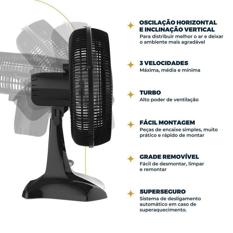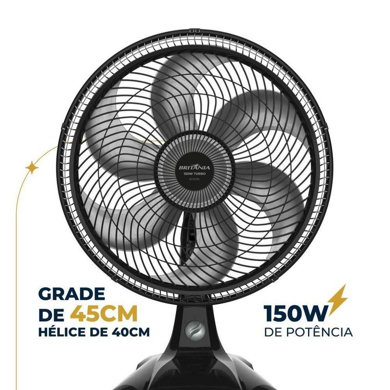 Ventilador Britânia BVT405 Tecnologia Maxx Force 110VExperimente o poder e a eficiência do nosso Ventilador de 150W! Ventilador Britânia BVT405 Tecnologia Maxx Force.Com a nova hélice de 6 pás e tecnologia Maxx Force, você conta com uma vazão de ar superior e um desempenho impressionante. A hélice de 40cm proporciona uma ventilação máxima, ideal para qualquer ambiente.Além disso, possui classificação energética A, que garante baixo consumo de energia sem comprometer a performance. O Ventilador Britânia BVT405 conta também com 3 velocidades: suave, moderada e intensa. Você ajusta a ventilação conforme sua necessidade.Nossa preocupação com a é prioridade! O motor interrompe o funcionamento em caso de superaquecimento e o sistema de travamento das grades evita acidentes. Com 3 opções de inclinação vertical e oscilação horizontal automática, você direciona o fluxo de ar como preferir. E a alça na grade traseira facilita o do aparelho para qualquer lugar. Utilize-o na mesa ou na parede, graças ao design 2 em 1 que oferece versatilidade. Transforme seu ambiente com conforto e praticidade com o Ventilador Britânia BVT405 Tecnologia Maxx Force 150W!- 3 velocidades- Hélice de 6 pás- Potência de 150W- Grade que atende às normas de ( com partes móveis)- Oscilação horizontal automática com sistema de acionamento (botão integrado à carcaça)- Sistema de articulação para ajuste da inclinação vertical - Porta-fio- sistema de travamento entre grade frontal e traseira- Alça na grade traseira para transportar o aparelho- Motor com fusível térmico de .Especificações Técnicas:Marca: BritâniaModelo: BVT405Cor da Estrutura: PretoQuantidade de pás: 6Potência (W): 150(W)Tipo: De parede De mesaDiâmetro (cm): 40Função repelente: NãoMaterial das Pás: PlásticoEstado: Altura do produto: 61,5 cmLargura do produto: 30 cmComprimento do produto: 30,8 cmPeso do produto: 2,86 kgAltura com embalagem: 58,3 cmLargura com embalagem: 46,6 cmComprimento com embalagem: 15,6 cmPeso com embalagem: 3,44 kgGarantia (Dias): 360Observação: Somente faturamos para o nosso consumidor final, ou seja, não faturamos pedidos para CNPJ por este portal de vendas;