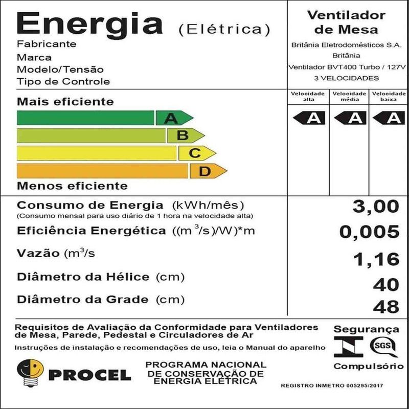 Ventilador Britânia Turbo 40cm 6 Pas 110V Bvt4000MOBILAR ELETRO HÁ MAIS DE 25 ANOS INOVANDO EM PRODUTOS E ATENDIMENTO VENTILADOR Britânia 40CM TURBO 6 PAS Ventilador Britânia BVT4000 tem 130W de potência e 3 velocidades para você refrescar e jogar o calor pra longe. O Sistema oscilante permite melhor distribuição do ar no ambiente deixando o ar mais fresco e agradável para dias ou noites mais tranquilas. 3 velocidades; Hélice de 6 pás de 40cm; Grade que obedece às normas de segurança (contato com partes móveis); Oscilação horizontal automática com novo sistema de acionamento (botão integrado à carcaça); Sistema de articulação para ajuste da inclinação vertical Novo sistema de travamento entre grade frontal e traseira; Remoção da grade frontal somente com uso de ferramenta, conforme normas de segurança; Motor com fusível térmico de segurança; Especificações Altura61,00cm Largura47,50cm Profundidade32,50cm Peso2,64Kg