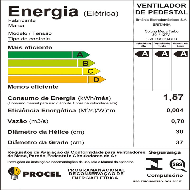 Ventilador de Coluna Britânia Mega Turbo 30 Six 75W 127V
