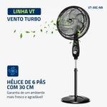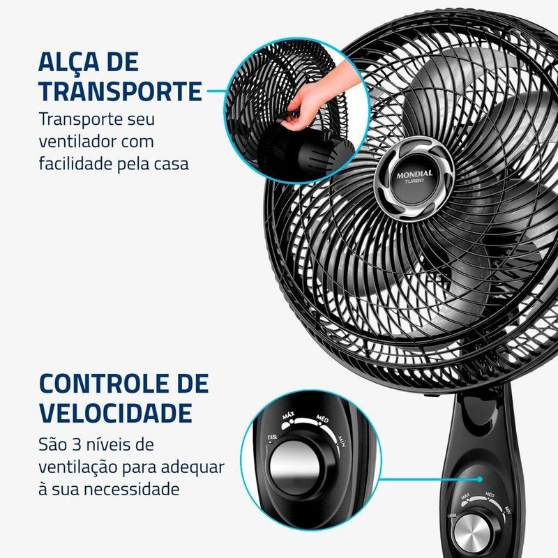 Ventilador De Coluna Mondial 30cm 6 Pás Turbo VT-30C-NB Preto/Prata 110VVentilador de Coluna Mondial 30cm 6 Pás Turbo VT-30C-NB Preto/Prata 127VO Ventilador de Coluna Turbo VT-30C-NB possui 30 cm de diâmetro, hélice com 6 pás e design aerodinâmico que garante forte ventilação, melhor de ar e um ambiente mais fresco e agradável. Com coluna ajustável entre 1,19 m e 1,50 m, permite regular a altura do vento conforme a necessidade. Além disso, o sistema de ventilação da Mondial apresenta baixo nível de ruído, assegurando silêncio para momentos de concentração e noites de sono mais tranquilas.DiferenciaisVento TurboLinha Turbo com 30 cm de diâmetro e hélice de 6 pás. O design aerodinâmico proporciona forte ventilação e melhor de ar.Coluna AjustávelRegulagem de altura entre 1,19 m e 1,50 m para ajuste ideal do vento.Mais Silêncio e ConfortoSistema de ventilação com baixo nível de ruído, garantindo bem-estar e tranquilidade.Inclinação Vertical RegulávelDirecionamento ideal do fluxo de ar.Controle de Velocidade3 opções de velocidade:Máxima TurboMédia ConfortoMínima SilenciosoFacilidade na LimpezaGrade frontal removível que facilita a limpeza das hélices, simplificando a lavagem e a remoção de poeira, garantindo melhor qualidade do ar.Especificações TécnicasModelo: VT-30C-NBCor: Preto/PrataVoltagem: 127VPotência: 50W de velocidades: 03Quantidade de pás: 06Tipo: Ventilador de ColunaColuna ajustável: SimInclinação regulável: SimOscilante: SimDimensões AproximadasAltura: 146 cmLargura: 39 cmProfundidade: 35,4 cmPeso: 4,7 kgItens Inclusos01 VentiladorManual de InstruçõesGarantia12 meses (3 meses de garantia legal + 9 meses para de fabricação).Observações ImportantesCertifique-se da montagem correta de todas as partes antes do uso.Confira o prazo de garantia no manual de instruções. Em caso de problemas, procure uma assistência técnica autorizada.No ato da , confira o produto. Em caso de anormalidade, recuse o .Todas as informações divulgadas são de responsabilidade do fabricante, podendo sofrer alterações sem aviso prévio.Imagem meramente ilustrativa.