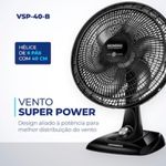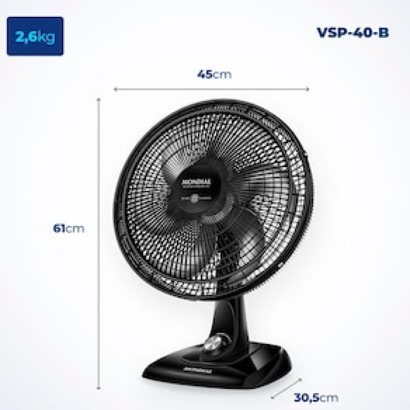 Com 40 cm e 3 velocidades, o Ventilador Mondial Super Power VSP-40-B é vento mais forte. Ele tem baixo nível de ruído, ajuste de altura, sistema oscilante lateral, inclinação vertical regulável, além ser compacto e ter baixo consumo. Sua hélice tem design aerodinâmico, o que proporciona um vento forte. Como ele faz menos barulho, em qualquer uma das 3 velocidades, você dorme tranquilamente. Para ambientes mais amplos, você pode usar o sistema oscilante. A inclinação vertical regulável direciona o fluxo de ar para cima ou para baixo. Como a grade frontal é removível, ele ainda é fácil de montar e desmontar para limpeza. Ele também é fácil de carregar porque tem uma alça para transporte. A base antiderrapante traz mais segurança.