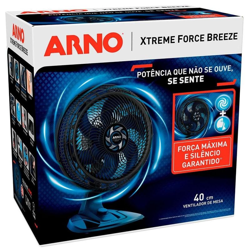 Dê adeus aos dias de extremo calor e tenha na sua casa o incrível Ventilador de Mesa Arno Xtreme Force VB40 40cm!Esse incrível ventilador irá refrescar seu ambiente nos dias quentes, mas quando chegar o friozinho ele pode ser desmontado e guardado no armário sem ocupar muito espaço, oferecendo facilidades e comodidade para sua casa!O modelo possui 3 velocidades que irá agradar a todos, a velocidade 3 é o "Turbo Silêncio", que garante vento forte e silencioso para alívio imediato do calor; a velocidade 2 "Eco Fresh" é até 20% mais econômica, ideal para deixar o ventilador ligado durante todo o dia sem preocupação e a velocidade 1, o "Silêncio/dormir" é ideal para a hora do sono, pois oferece vento moderado com silêncio garantido.O Arno Xtreme Force VB40 conta ainda com a exclusiva Power Zone, área de máxima concentração de vento, além de 4 inclinações verticais com inclinação para o chão e oscilação horizontal. Seu ambiente ficará muito mais fresquinho com ele, aproveite!