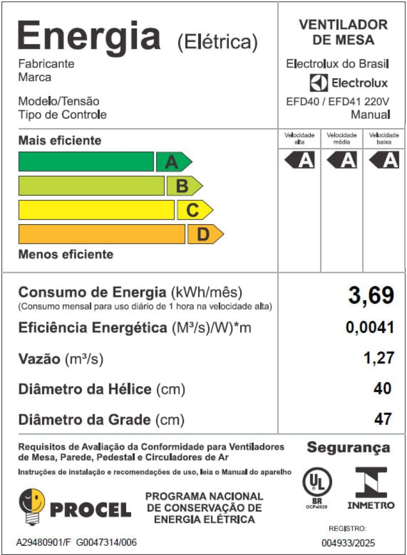 O novo Ventilador de Mesa Electrolux 40cm 6 Pás Efficient com DuoForce Air+ Cinza (EFD40) é a escolha ideal para quem busca desempenho silencioso e um vento poderoso capaz de refrescar dias quentes e tornar o ambiente mais agradável. Graças à Tecnologia DuoForce Air+, que combina o desenho aerodinâmico da hélice de 6 pás ao motor potente, ele proporciona um fluxo de ar com longo alcance de até 17 metros¹, distribuindo o vento fresco pelo cômodo. Conte com a qualidade da Electrolux, que oferece 2 anos de garantia para seu produto, além de um design inovador pensado para tornar seu dia a dia mais prático.Este ventilador oferece uma montagem em cliques, permitindo que a hélice e a grade sejam desmontadas² quando o produto não está em uso, o que facilita a limpeza. O produto pode ser desmontado² para armazenar de forma compacta e facilitar a organização. O Ventilador de Mesa Electrolux Efficient com DuoForce Air+ (EFD40) tem eficiência energética A em todas as velocidades, até mesmo na Turbo. Com certificação do Selo Procel, garante alto desempenho com consumo inteligente de energia.Para fixar o fluxo de ar em um ponto específico ou distribuir para as laterais com o movimento horizontal do ventilador, basta pressionar o botão intuitivo do sistema oscilanete. E, para ainda mais conforto, é possível escolher entre três velocidades: Mínima, para um funcionamento silencioso; Média, que reduz o consumo de energia em até 20%³; ou Turbo, para máxima refrescância nos dias mais quentes.É recomendado o uso de acessórios originais Electrolux.¹De acordo com testes internos da Electrolux.²Sempre desconecte o produto da tomada antes de iniciar o processo de desmontagem.³Comparando o consumo de energia no modo turbo (velocidade máxima) e no modo econômico (velocidade média).