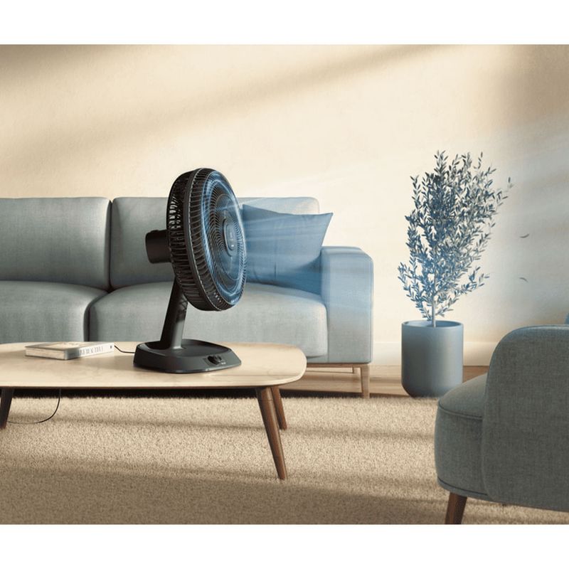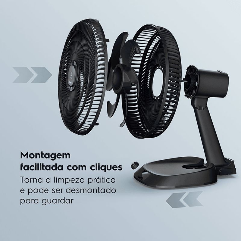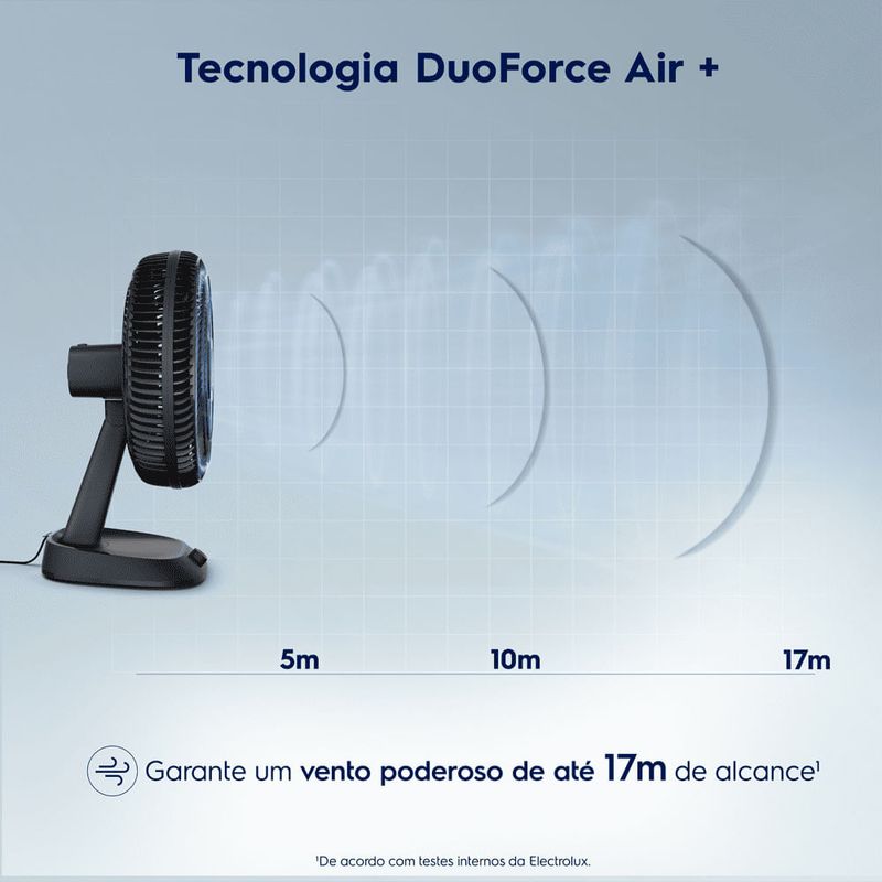 O Ventilador de Mesa Electrolux 40cm 6 Pás Efficient DuoForce Air+ Cinza (EFD40) é a solução perfeita para enfrentar os dias mais quentes com máximo conforto e alta performance.O novo Ventilador de Mesa Electrolux 40cm 6 Pás Efficient com DuoForce Air+ Cinza (EFD40) é a escolha ideal para quem busca desempenho silencioso e um vento poderoso capaz de refrescar dias quentes e tornar o ambiente mais agradável.Graças à Tecnologia DuoForce Air+, que combina o desenho aerodinâmico da hélice de 6 pás ao motor potente, ele proporciona um fluxo de ar com longo alcance de até 17 metros, distribuindo o vento fresco pelo cômodo. Conte com a qualidade da Electrolux, que oferece 2 anos de garantia para seu produto, além de um design inovador pensado para tornar seu dia a dia mais prático. Este ventilador oferece uma montagem em cliques, permitindo que a hélice e a grade sejam desmontadas quando o produto não está em uso, o que facilita a limpeza. O produto pode ser desmontado para armazenar de forma compacta e facilitar a organização. O Ventilador de Mesa Electrolux Efficient com DuoForce Air+ (EFD40) tem eficiência energética A em todas as velocidades, até mesmo na Turbo. Com certificação do Selo Procel, garante alto desempenho com consumo inteligente de energia. Para baixar o fluxo de ar em um ponto específico ou distribuir para as laterais com o movimento horizontal do ventilador, basta pressionar o botão intuitivo do sistema oscilante. E, para ainda mais conforto, é possível escolher entre três velocidades: Mínima, para um funcionamento silencioso; Média, que reduz o consumo de energia em até 20%; ou Turbo, para máxima refrescancia nos dias mais quentes. CaracterísticasTipo: Ventilador de MesaVelocidades: 03, mínima, média e turboDiâmetro: 40cmQuantidade de Pás: 06Tecnologia DuoForce Air+Alcance de até 17 metrosBotão Intuitivo de Sistema Oscilante Especificações TécnicasModelo: EFD40Potência: 126WSelo Procel (Eficiência Energética): AVoltagem: 110V / 220V (não é bivolt)Cor: CinzaEAN: 7909569473153 (110V) / 7909569473160 (220V)Garantia: 24 meses Dimensões e PesoDimensões do produto sem embalagem (AxLxP): 654x479x340 mmDimensões do produto com embalagem (AxLxP): 654x539x181 mmPeso do produto sem embalagem: 3,55 KgPeso do produto com embalagem: 4,20 Kg Itens Inclusos01 Ventilador