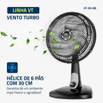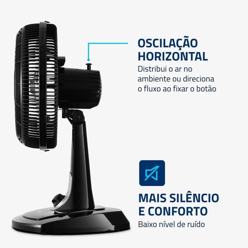 Ventilador de Mesa Mondial Turbo 06 Pás VT-30-NB 110VO ventilador de coluna Turbo VT-30-NB possui 30 cm de diâmetro, hélice com 6 pás e um design aerodinâmico que garante um ambiente mais fresco e arejado. Já o sistema de ventilação da Mondial apresenta baixo nível de ruído e assegura o silêncio necessário para momentos de concentração e uma excelente noite de sono.Saiba mais sobre o VT-30-NB:- VENTO TURBO: A linha de Ventiladores Turbo possui 30cm de diâmetro e hélice com 6 Pás. O design aerodinâmico proporciona forte ventilação e melhor distribuição de ar. O resultado é um ambiente mais fresco e agradável!- COLUNA AJUSTÁVEL: Possui regulagem de 1,19 a 1,50 metros, permitindo o ajuste ideal da altura do vento.- MAIS SILÊNCIO E CONFORTO: O sistema de ventilação da Mondial apresenta baixo nível de ruído, assegurando o silêncio necessário para momentos de concentração e uma excelente noite de sono.- MAIOR DISTRIBUIÇÃO DE AR: O Sistema Oscilante Contínuo amplia o raio de alcance do vento no ambiente, permitindo uma distribuição de ar mais eficiente nos cômodos da casa.- INCLINAÇÃO ICAL REGULÁVEL: Para um direcionamento ideal do fluxo do ar.- CONTROLE DE VELOCIDADE: As 3 opções de velocidade permitem adequar o vento à sua necessidade: Máxima Turbo, Média Conforto e Mínima Silencioso.- FACILIDADE NA LIMPEZA: A grade frontal removível oferece mais facilidade na limpeza das hélices, o que simplifica a lavagem e a remoção de poeira, e garante melhor qualidade do ar.- ALÇA DE TRANSPORTE + PORTA-FIO: Além do design compacto, a alça traseira permite que o ventilador seja transportado entre os cômodos da casa com facilidade. Com o porta-fio embutido, você armazena o fio elétrico dentro do aparelho após o uso.- UM ANO DE GARANTIA MONDIAL: A Mondial é a escolha de milhões de consumidores. Mondial, a escolha inteligente!Especificações Técnicas:- Modelo: VT-30-NB- Cor: Preto/Prata- Voltagem (Tensão): 110V- Itens inclusos: 01 Ventilador; Manual de Instruções.- Potência: 60W- Dimensões do produto: 61,50cm x 39cm x 35,40cm (AxLxP)- Número de velocidades: 3- Quantidade de pás: 6- Controle remoto: Não- Coluna ajustável: Não- Tipo de ventilador: Ventilador de Mesa- Peso: 2,000kg- Inclinação regulável: Sim- Oscilante: Sim, lateral- Garantia: 01 ano- Marca: Mondial