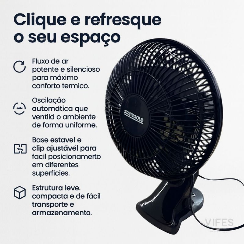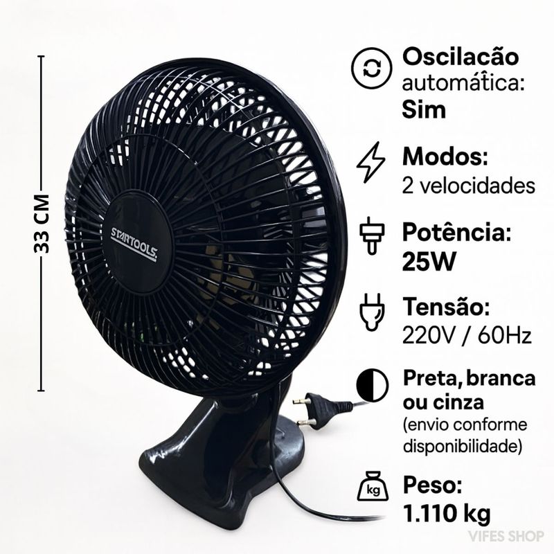 Refresque Qualquer Ambiente com Conforto, Estilo e Eficiência! Tenha mais conforto e bem-estar em todos os momentos com o Ventilador de Mesa Portátil 220V com Oscilação Automática. Ideal para uso doméstico ou profissional, este modelo compacto oferece ventilação potente e silenciosa, garantindo frescor e tranquilidade em qualquer espaço. Seu design moderno e estrutura leve tornam o transporte e o uso extremamente práticos. A função oscilante automática distribui o ar de maneira uniforme, evitando pontos quentes e proporcionando uma sensação térmica agradável durante todo o dia. Feito com materiais resistentes e duráveis, o ventilador alia eficiência energética, segurança certificada pelo Inmetro e baixo consumo, sendo perfeito para quem busca desempenho e economia. Principais Características: • Fluxo de ar potente e silencioso para máximo conforto térmico. • Oscilação automática que ventila o ambiente de forma uniforme. • Base estável e clip ajustável para fácil posicionamento em diferentes superfícies. • Estrutura leve, compacta e de fácil transporte e armazenamento. Especificações Técnicas • Dimensões: Ventilador 33 cm (diâmetro) / Base 10 cm (A) x 14 cm (C) x 11 cm (L) • Composição: PP, cobre, metal e componentes eletrônicos • Grau de proteção: IPX0 • Oscilação automática: Sim • Modos: 2 velocidades • Potência: 25W • Tensão: 220V / 60Hz • Cor: Preta, branca ou cinza (envio conforme disponibilidade) • Peso: 1,110 kg • Registro Inmetro: 003773/2025 Conteúdo do Pacote • 01 Ventilador de Mesa Portátil 220V com Oscilação • 01 Base de apoio • 01 Manual em português Bem-vindo à VIFES SHOP! Aqui você encontra produtos que unem qualidade, praticidade e design moderno. Trabalhamos com o compromisso de oferecer soluções que tornam o seu dia a dia mais confortável e funcional. Perguntas Frequentes • O ventilador é silencioso? Sim, possui motor de baixo ruído, ideal para uso durante o sono ou em ambientes de trabalho. • É possível ajustar a inclinação? Sim, o modelo conta com ajuste de ângulo para direcionar o fluxo de ar conforme sua necessidade. • Tem certificação de segurança? Sim, o produto é certificado pelo Inmetro, garantindo confiabilidade no uso. • Pode ser utilizado em qualquer superfície? Sim, sua base é estável e o clip ajustável permite fixação segura em mesas ou prateleiras. • É fácil de transportar? Sim, o ventilador é leve, compacto e fácil de mover entre diferentes ambientes. Adquira já o seu Ventilador de Mesa Portátil 220V com Oscilação Automática e desfrute de conforto e eficiência todos os dias. Acesse nossa loja VIFES SHOP e descubra outros produtos que vão transformar o seu ambiente!