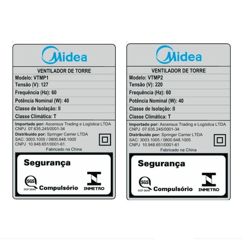 Ventilador De Torre Preto Midea VTMP2 220VO Ventilador Torre Midea é perfeitamente prático para sua casa . Ele é portátil e com sistema de oscilação horizontal, proporcionando um fluxo de ar melhor distribuído por todo ambiente. Conta com temporizador de 2 horas, 3 níveis de velocidade e 1 metro de altura. Sistema de oscilação horizontal: Proporcionando um fluxo de ar melhor distribuído por todo o ambiente. - Temporizador de 2 horas- Torre de 1 metro de altura- 3 níveis de velocidade- Alta potência- Baixo nível de ruído- Mecânico e de fácil manuseio pelo consumidor.Atenção: Esta loja não fatura para CNPJ.Especificações Técnicas:Tipo de ventilador: TorreOrigem: ImportadoCiclo: Só FrioCor interna: PretoMaterial Externo: PlásticoCor: PretoMaterial Interno: PlásticoVentilador: SimProduto conectado: NãoIonizador: NãoVelocidades: 3Direcionadores de ar: HorizontalRede de filtragem lavável: NãoPainel Digital: NãoPortátil: SimPossui Rodinhas: NãoMaterial do Reservatório: NãoTimer: SimControle Remoto: NãoFrequência (Hz): 60 HzTipo de Tomada (127v): 10 ATipo de tomada (220v): 10 APotência (127v): 40WAltura: 102,5 cmLargura: 31,0 cmProfundidade: 31,0 cmPeso: 3,5 kgGarantia do Produto: 12 meses (1 ano)