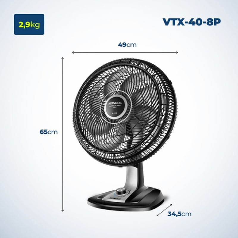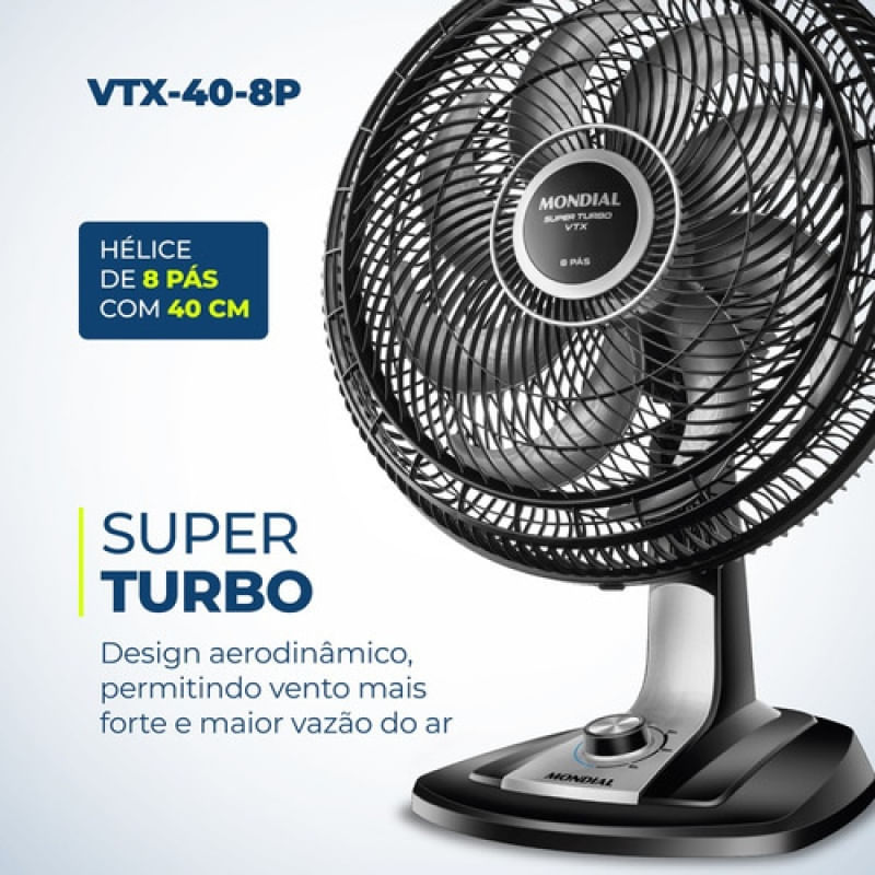 MOBILAR ELETRO HÁ MAIS DE 25 ANOS INOVANDO EM PRODUTOS E ATENDIMENTOVENTILADOR MONDIAL 40 CM 8 PAS TURBO + SILENCIOSO 20% MAIS POTENTE 140WTS POTENCIA COM VTX40Fácil de transportar, sistema oscilante permite ampla distribuição do ar pelo ambiente, inclinação vertical regulável direciona o fluxo de ar, porta-cabo na base, 8 pás (20% mais vento) e grade desmontável facilita a limpeza!Controle de velocidade: Velocidade máxima 3 - Turbo 8 Pás;Velocidade média 2 - Mais conforto;Velocidade mínima 1 - Silencioso/Dormir; Potência : 140 waltura 51cmlargura 50cmprofundidade 31cmpeso 3,15 kg