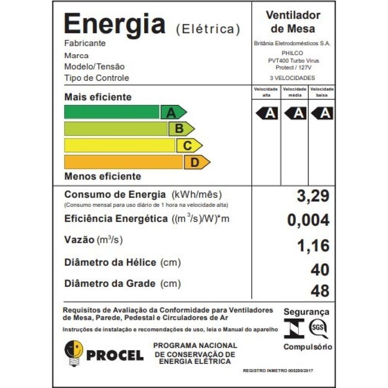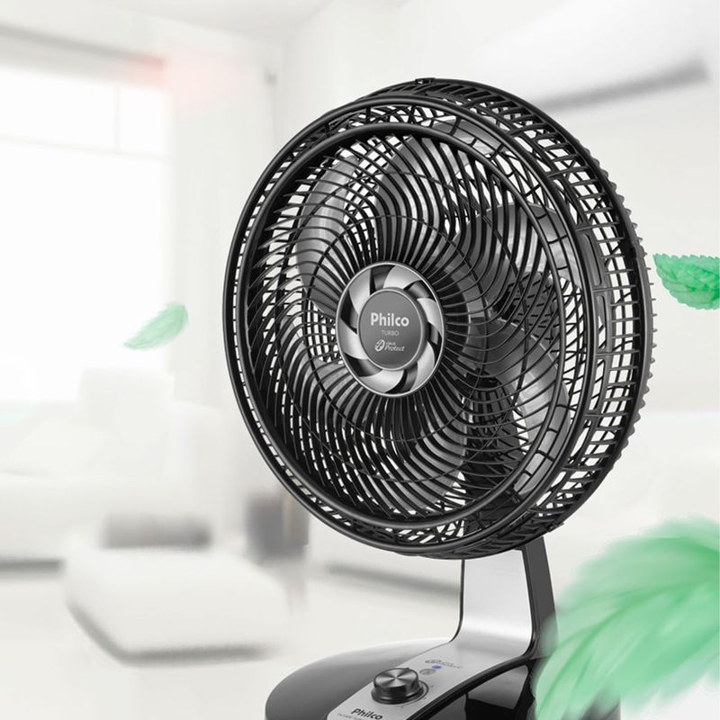 Se refresque com o Ventilador Philco Turbo Virus Protect. Ventilador de mesa, possui hélice com 6 pás e diâmetro de 40cm, sistema oscilante, garantindo um excelente desempenho! Com 160W de potência e 3 velocidades, que variam entre mínima, média e máxima, a eficiência de ventilação com o seu Ventilador Philco está garantida. Além de oferecer inclinação vertical regulável, proporcionando melhor direcionamento do fluxo de ar, a grade do Ventilador é plástica e removível, facilitando a limpeza. O Ventilador é Vírus Protect, ou seja, diminui em até 99% a proliferação de vírus, bactérias e mofo dentro do ambiente, e elimina odores, fumaça e partículas de pólen presentes no ar. Seu fusível térmico de segurança e porta fio garantem praticidade até na hora de guardar. Quer economia de energia? Conte com o Ventilador Philco, pois ele possui classificação energética A para você curtir os dias mais quentes sem se preocupar com a conta de luz. Com o Ventilador Philco Turbo Virus Protect sua casa fica do jeitinho que você gosta! • Hélice de 6 pás • Grade que obedece às normas de segurança (contato com partes móveis) • Oscilação horizontal automática com novo sistema de acionamento (botão integrado à carcaça) • Sistema de articulação para ajuste da inclinação vertical • Porta-fio • Novo sistema de travamento entre grade frontal e traseira • Remoção da grade frontal somente com uso de ferramenta, conforme normas de segurança • Motor com fusível térmico de segurança • Alça na grade traseira para transportar o aparelho. • Sistema com ionizador.