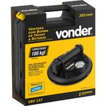 Código Fornecedor: 6001137000Marca: Vonder Conteúdo da embalagem:1 Ventosa a bateria. Acompanha: 1 fonte bivolt automático e 1 maleta.Destaques e diferenciais:Ventosa com bomba a vácuo a bateria, ideal para realização de trabalhos com muito mais eficácia e segurança. Possui sistema de desligamento automático, quando atinge a pressão máxima e trabalha em regime intermitente ajustando a pressão. Capacidade de carga de 100 kgf.Aplicações e dicas de uso:Indicada para manusear, movimentar superfícies planas, como: porcelanatos de grande formato e peso, vidro, metal, cerâmica, madeira laminada, entre outros. Utilizada também para transportar e movimentar móveis, geladeiras, fogões, entre outros.Detalhes TécnicosModelo: VBV 137 Material da ventosa: Borracha Material do suporte e alça da ventosa: PA6-GF30 (fibra de vidro reforçada) Capacidade total de carga da ventosa: 100 kgf Diâmetro da ventosa: 203 mm Tipo da alimentação da ventosa: Bateria Tipo da bateria: Íons de Lítio Tensão da bateria (V): 3,7 V Capacidade da bateria (A): 900 mAh Tempo de carregamento da bateria: 2 horas Tensão de entrada da fonte: 100 V~ - 240 V~ - Bivolt automático Desligamento automático: Desligamento automático quando atinge a pressão máxima. Produto trabalha em regime intermitente ajustando a pressão. Massa aproximada (peso) (kg): 1,027 kg Garantia - E (CDC):Garantia legal: 90 dias + Garantia contratual: 9 meses (Para locadoras, garantia única e exclusiva de 90 dias)