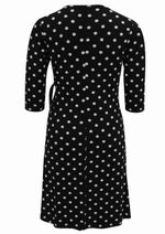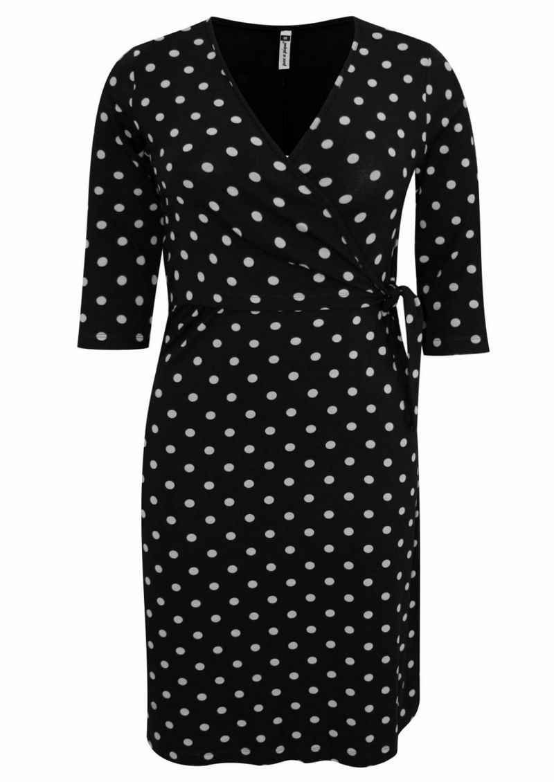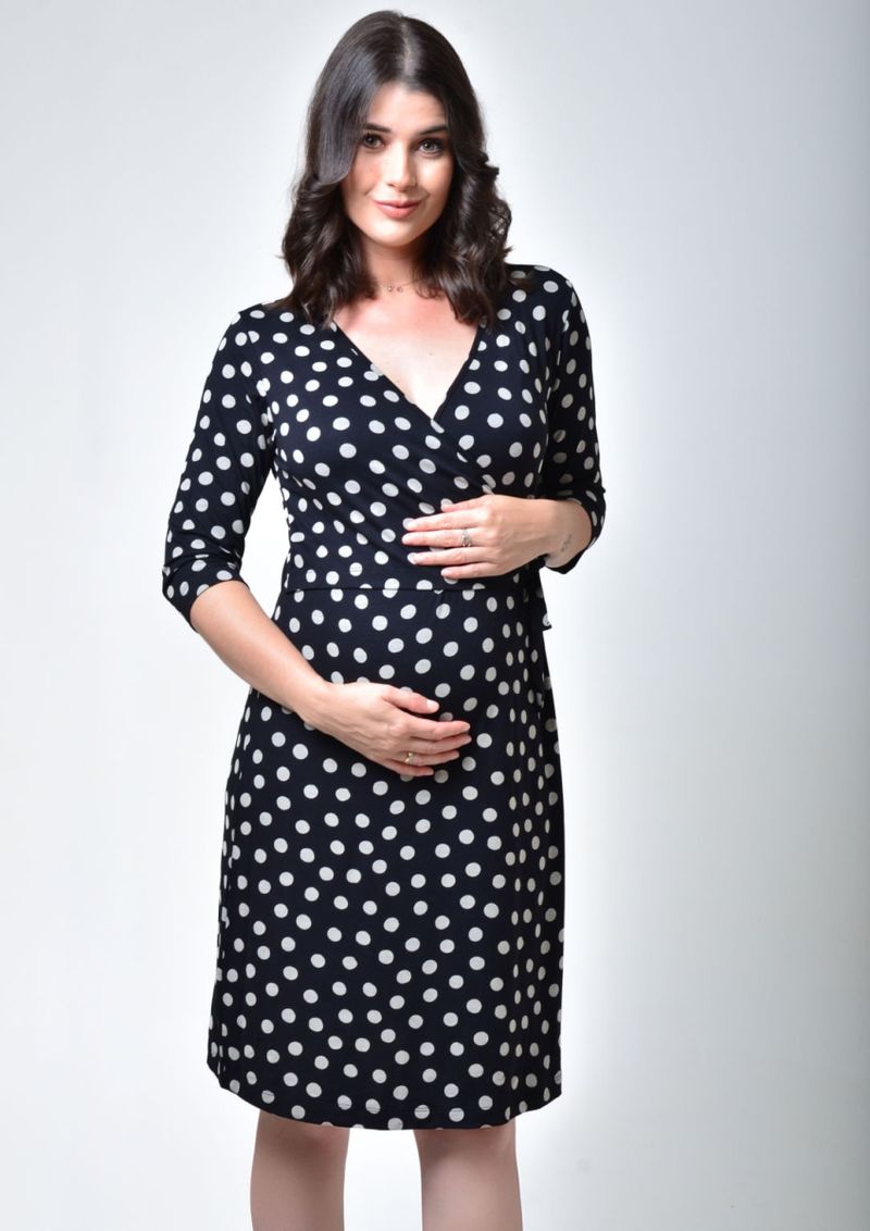 Vestido manga ¾ com decote em “V”composto por detalhe transpassado . Malha do vestido com estampa em poá, e fundo na cor Preto. Modelagem ajustada ao corpo. Possui detalhe de amarração frontal. Elegante, confortável e lindo! Arrase!!! Composição da Malha: Confeccionado em 96% Viscose e 4% Elastano. Construído em "Viscolycra" com toque macio. Medidas Aproximadas: P: 101 x 94 x 90 x 106 cm (Altura, Busto, Cintura e Quadril). M: 103 x 100 x 96 x 112 cm (A, B, C, Q). G: 105 x 106 x 102 x 118 cm (A, B, C, Q). GG: 107 x 112 x 108 x 124 cm (A, B, C, Q). XL: 109 x 118 x 114 x 130 cm (A, B, C, Q). Todos os dados informados são aproximados, do peso às medidas.