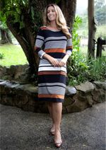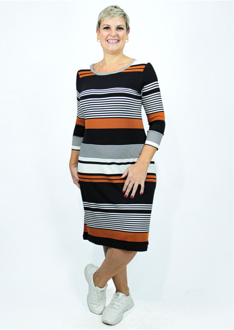 Vestido com mangas 3/4 e decote redondo. Malha listrada em tons de Preto, Mostarda e Off White. Acabamento das mangas com punho no mesmo tecido da peça. Modelo com caimento perfeito e combinação de cores que transmite fineza e muito bom gosto. Confira!!! Composição da malha: Confeccionado em 96% Viscose e 4% Elastano. Construído em "Viscolycra" com toque macio. Medidas Aproximadas: P: 94cm Comprimento x 94cm Busto x 92cm Cintura x 108cm Quadril x 41cm manga. M: 96cm Comprimento x 100cm Busto x 98cm Cintura x 114cm Quadril x 43cm manga. G: 98cm Comprimento x 106cm Busto x 104cm Cintura x 120cm Quadril x 45cm manga. GG: 100cm Comprimento x 112cm Busto x 110cm Cintura x 126cm Quadril x 47cm manga. XL: 102cm Comprimento x 118cm Busto x 116cm Cintura x 132cm Quadril x 49cm manga. Todos os dados informados são aproximados, do peso às medidas. ATENÇÃO PARA AS MEDIDAS. MODELAGEM AMPLA! *Modelo está usando o tamanho P*