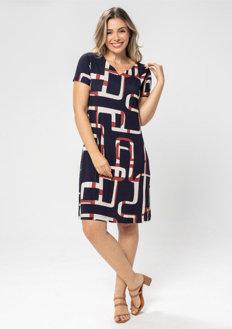 Vestido com decote princesa e mangas curtas. Estampado em Vermelho e Off White sobre o fundo Azul Marinho. Modelo em Viscocrepe, tecido de excelente qualidade e alta durabilidade. É confortável, macio, leve com ótima capacidade de absorção. Permita-se!!! Composição da malha: Confeccionado em Viscocrepe 96% Viscose e 4% Elastano. Medidas Aproximadas: PP: 92cm Comprimento x 88cm Busto x 82cm Cintura x 100cm Quadril. P: 94cm Comprimento x 94cm Busto x 88cm Cintura x 106cm Quadril. M: 96cm Comprimento x 100cm Busto x 94cm Cintura x 112cm Quadril. G: 98cm Comprimento x 106cm Busto x 100cm Cintura x 118cm Quadril. GG: 100cm Comprimento x 112cm Busto x 106cm Cintura x 124cm Quadril. XL: 102cm Comprimento x 118cm Busto x 112cm Cintura x 130cm Quadril. Todos os dados informados são aproximados, do peso às medidas. ATENÇÃO PARA AS MEDIDAS, POIS NOSSA MODELAGEM É AMPLA!