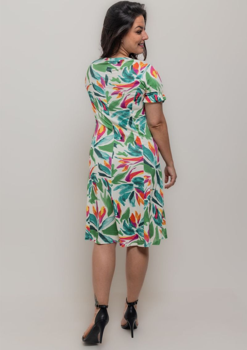 Vestido modelo evasê, com decote em "V". Mangas curtas, compostas por elástico. Malha estampada com predominância nos tons de Verde sobre o fundo Bege. Modelagem soltinha ao corpo. Elegante, confortável e lindo! Arrase!!! Composição da Malha: Confeccionado em 96% Viscose e 4% Elastano. Construído em "Viscolycra" com toque macio. Medidas Aproximadas: P: 97 x 88 x 82 x 100 cm (Comprimento, Busto, Cintura e Quadril). M: 99 x 94 x 88 x 106 cm (Comprimento, Busto, Cintura e Quadril). G: 101 x 100 x 94 x 112 cm (Comprimento, Busto, Cintura e Quadril). GG: 103 x 106 x 100 x 118 cm (Comprimento, Busto, Cintura e Quadril). XL: 105 x 112 x 106 x 124 cm (Comprimento, Busto, Cintura e Quadril). Todos os dados informados são aproximados, do peso às medidas. ATENÇÃO PARA AS MEDIDAS. MODELAGEM AMPLA.