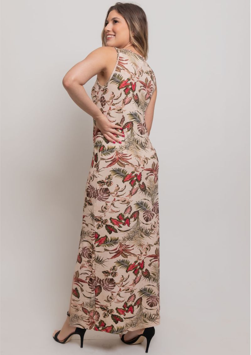 Vestido longo com decote redondo. Malha estampada sobre o em tons de Bege, Rosê, Verde e Vermelho. Modelo regata. Possui 1 fenda frontal. Confortável e elegante, compõem looks despojados. Arrase! Composição da Malha: Confeccionado em 96% Viscose e 4% Elastano. Construído em "Viscolycra" com toque macio. Medidas Aproximadas: P: 134 x 94 x 100 x 114 cm (Comprimento, Busto, Cintura e Quadril). M: 136 x 100 x 106 x 120 cm (Comprimento, Busto, Cintura e Quadril). G: 138 x 106 x 112 x 126 cm (Comprimento, Busto, Cintura e Quadril). GG: 140 x 112 x 118 x 132 cm (Comprimento, Busto, Cintura e Quadril). XL: 142 x 118 x 124 x 138 cm (Comprimento, Busto, Cintura e Quadril). Todos os dados informados são aproximados, do peso às medidas. ATENÇÃO PARA AS MEDIDAS, POIS NOSSA MODELAGEM É AMPLA.