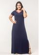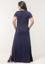 Vestido longo em malha Azul Marinho, com decote em "V" e mangas curtas. Possui aberturas laterais e bolsos frontais com acabamento em viés vermelho. Detalhe em malha listrada de vermelho e branco no decote e mangas. Confortável e elegante, compõem looks despojados. Arrase! Composição da Malha: Confeccionado em 96% Viscose e 4 % Elastano. Construído em "Viscolycra" com toque macio. Medidas Aproximadas: P: 134 x 90 x 88x 102 cm (Comprimento, Busto, Cintura e Quadril). M: 136 x 96 x 94 x 108 cm (Comprimento, Busto, Cintura e Quadril). G: 138 x 102 x 100 x 114 cm (Comprimento, Busto, Cintura e Quadril). GG: 140 x 108 x 106 x 120 cm (Comprimento, Busto, Cintura e Quadril). XL: 142 x 114 x 112 x 126 cm (Comprimento, Busto, Cintura e Quadril). Todos os dados informados são aproximados, do peso às medidas. ATENÇÃO PARA AS MEDIDAS, POIS NOSSA MODELAGEM É AMPLA.
