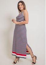 Vestido longo com decote redondo, composto por martingale e botão. Regata com alças largas. Possui fenda nas laterais. Malha listrada em Vermelho, Marinho e Off White. Confortável e elegante. Permita-se! Composição da malha: Confeccionado em 95% Viscose e 5% Elastano. Construído em "Viscolycra" com toque macio. Medidas Aproximadas: P: 130 x 86 x 88 x 102 cm (Comprimento, Busto, Cintura e Quadril). M: 132 x 92 x 94 x 108 cm (Comprimento, Busto, Cintura e Quadril). G: 134 x 98 x 100 x 114 cm (Comprimento, Busto, Cintura e Quadril). GG: 136 x 104 x 106 x 120 cm (Comprimento, Busto, Cintura e Quadril). XL: 138 x 110 x 112 x 126 cm (Comprimento, Busto, Cintura e Quadril). Todos os dados informados são aproximados, do peso às medidas. ATENÇÃO PARA AS MEDIDAS, POIS NOSSA MODELAGEM É AMPLA!