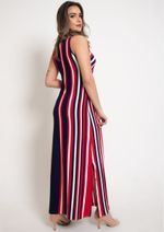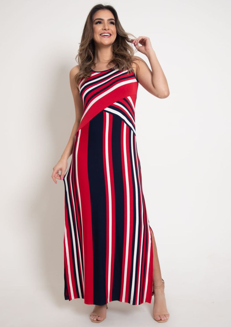 Vestido Longo Pau a Pique Listrado Vermelho e Azul Marinho