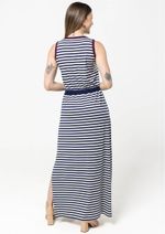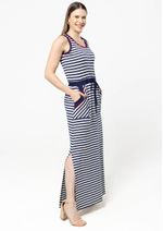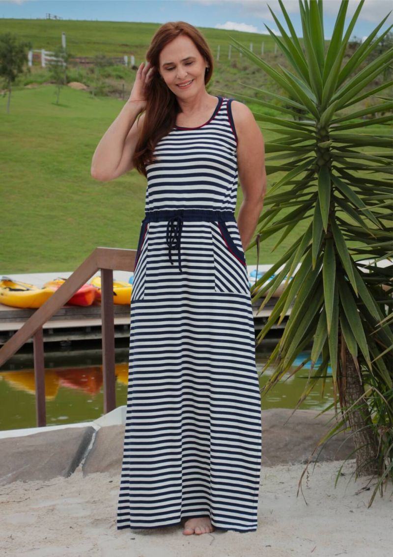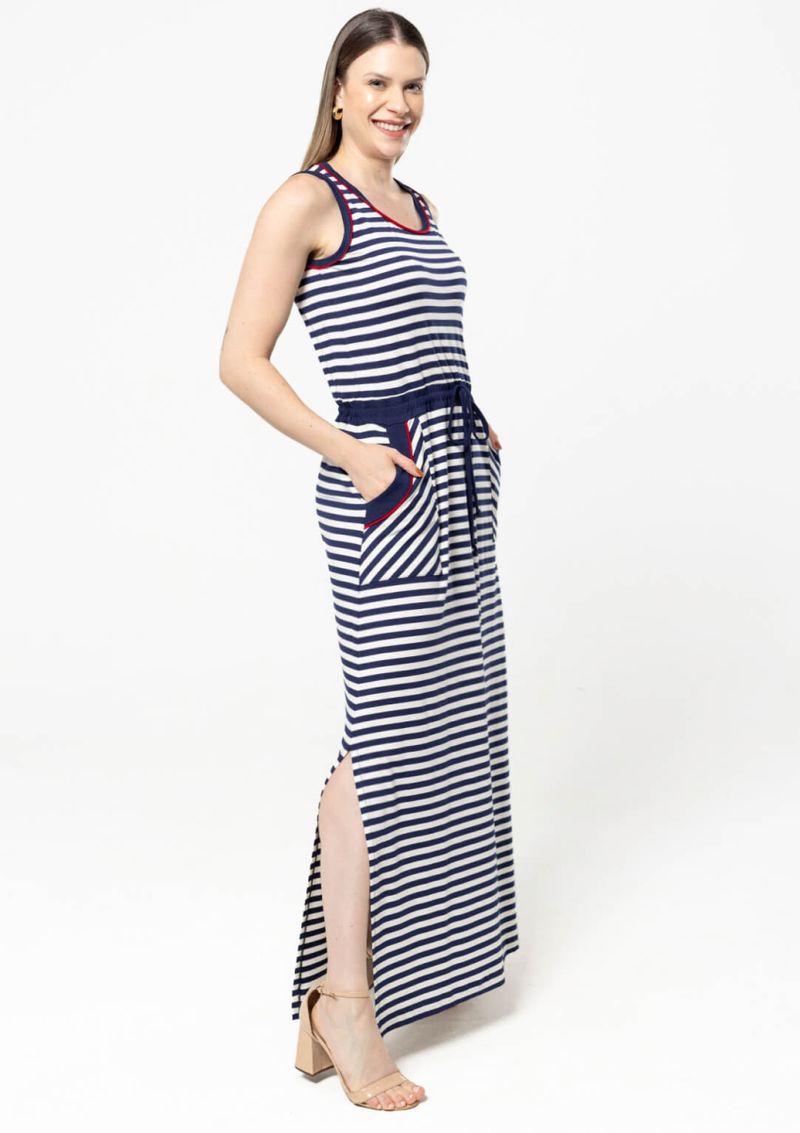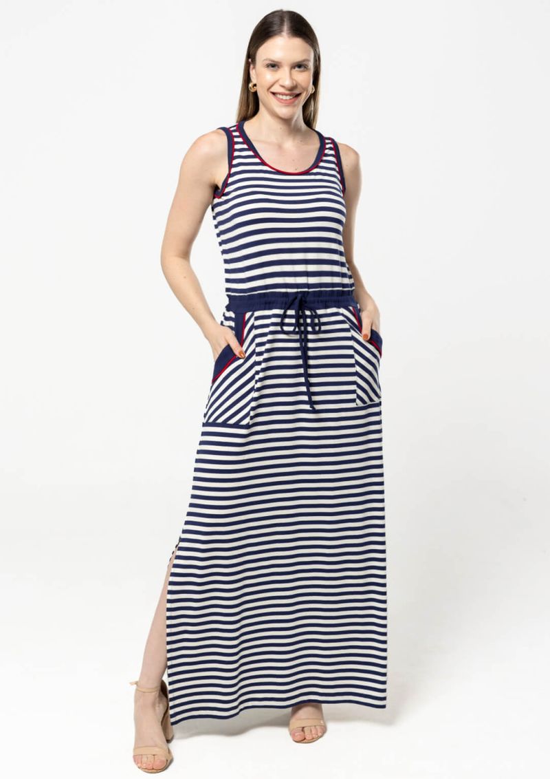 Vestido regata longo com alças largas e decote redondo. Listrado na cor Azul Marinho e Off White . Modelo com cordão ajustável na cintura e friso vermelho no acabamento dos bolsos, decote e cavas. Possui bolsos e fendas laterais, combinação que deixa o modelo muito mais elegante. Esse vestido tem muita personalidade e praticidade para o seu dia a dia. Permita-se!!! Composição da malha: Confeccionado em 96% Viscose e 4%elastano. Medidas Aproximadas: P: 133cm Comprimento x 88cm Busto x 84cm Cintura x 104cm Quadril. M: 135cm Comprimento x 94cm Busto x 90cm Cintura x 110cm Quadril. G: 137cm Comprimento x 100cm Busto x 96cm Cintura x 116cm Quadril. GG: 139cm Comprimento x 106cm Busto x 102cm Cintura x 122cm Quadril. XL: 141cm Comprimento x 112cm Busto x 108cm Cintura x 128cm Quadril. Todos os dados informados são aproximados, do peso às medidas. ATENÇÃO PARA AS MEDIDAS. MODELAGEM AMPLA. *Modelo está usando o tamanho P*