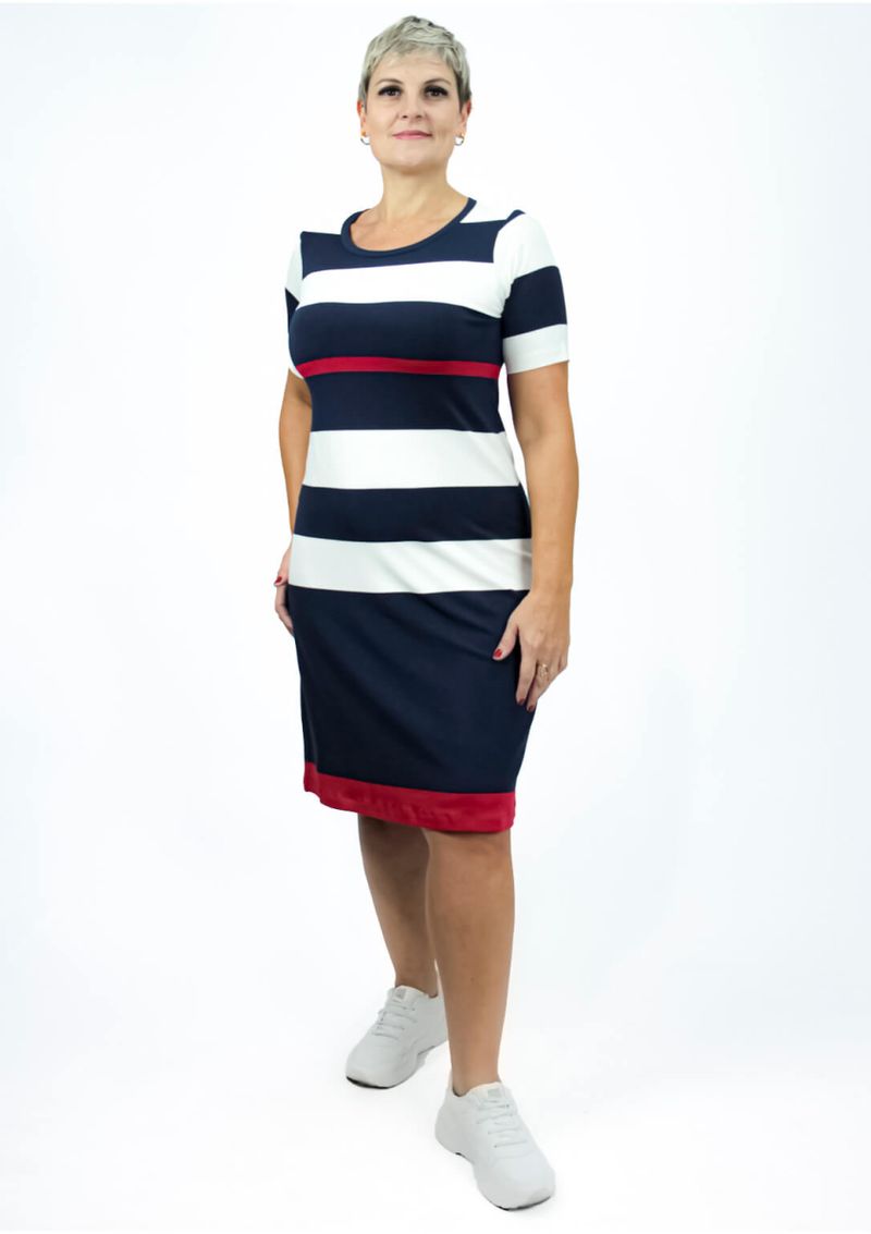 Vestido decote redondo e mangas curtas. Listrado em Azul Marinho, Off White e Vermelho. Vestido é aquela peça chave para se vestir com elegância e estilo. Modelo que valoriza ainda mais o seu corpo, deixando seu visual encantador. Confira!!! Composição da malha: Confeccionado em 92% Viscose e 8% Elastano. Medidas Aproximadas: P: 96cm Comprimento x 90cm Busto x 86cm Cintura x 104cm Quadril. M: 98cm Comprimento x 96cm Busto x 92cm Cintura x 110cm Quadril. G: 100cm Comprimento x 102cm Busto x 98cm Cintura x 116cm Quadril. GG: 102cm Comprimento x 108cm Busto x 104cm Cintura x 122cm Quadril. XL: 104cm Comprimento x 114cm Busto x 110cm Cintura x 128cm Quadril. Todos os dados informados são aproximados, do peso às medidas. ATENÇÃO PARA AS MEDIDAS. MODELAGEM AMPLA. *Modelo está usando o tamanho P*