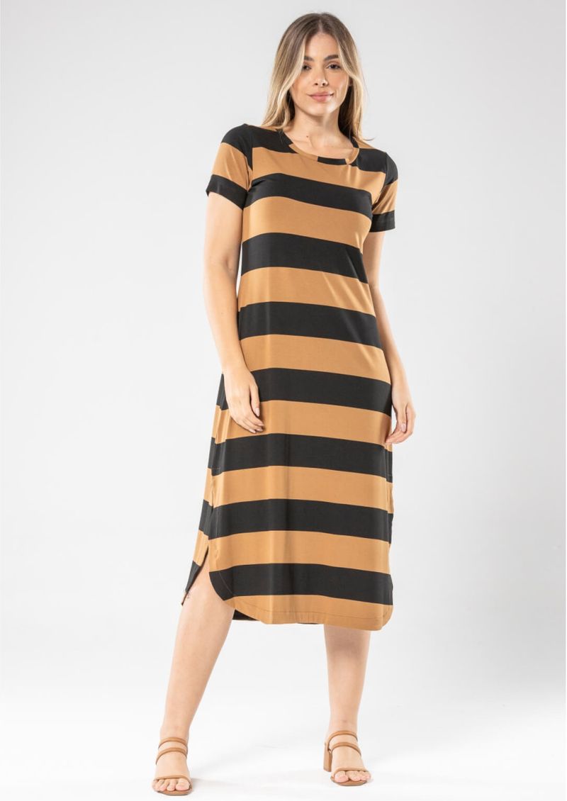 Vestido manga curta e decote redondo. Listrado em Preto e Marrom Claro. Possui barra arredondada e aberturas laterais proporcionando muito mais charme ao modelo. O comprimento midi abaixo do joelho, geralmente termina na canela e oferece um toque de sofisticação. Confira!!! Composição da malha: Confeccionado em 92% Viscose e 8% Elastano. Medidas Aproximadas: P: 116cm Comprimento x 92cm Busto x 88cm Cintura x 102cm Quadril. M: 118cm Comprimento x 98cm Busto x 94cm Cintura x 108cm Quadril. G: 120cm Comprimento x 104cm Busto x 100cm Cintura x 114cm Quadril. GG: 122cm Comprimento x 110cm Busto x 106cm Cintura x 120cm Quadril. XL: 124cm Comprimento x 116cm Busto x 112cm Cintura x 126cm Quadril. Todos os dados informados são aproximados, do peso às medidas. ATENÇÃO PARA AS MEDIDAS. MODELAGEM AMPLA. *Modelo está usando o tamanho P*