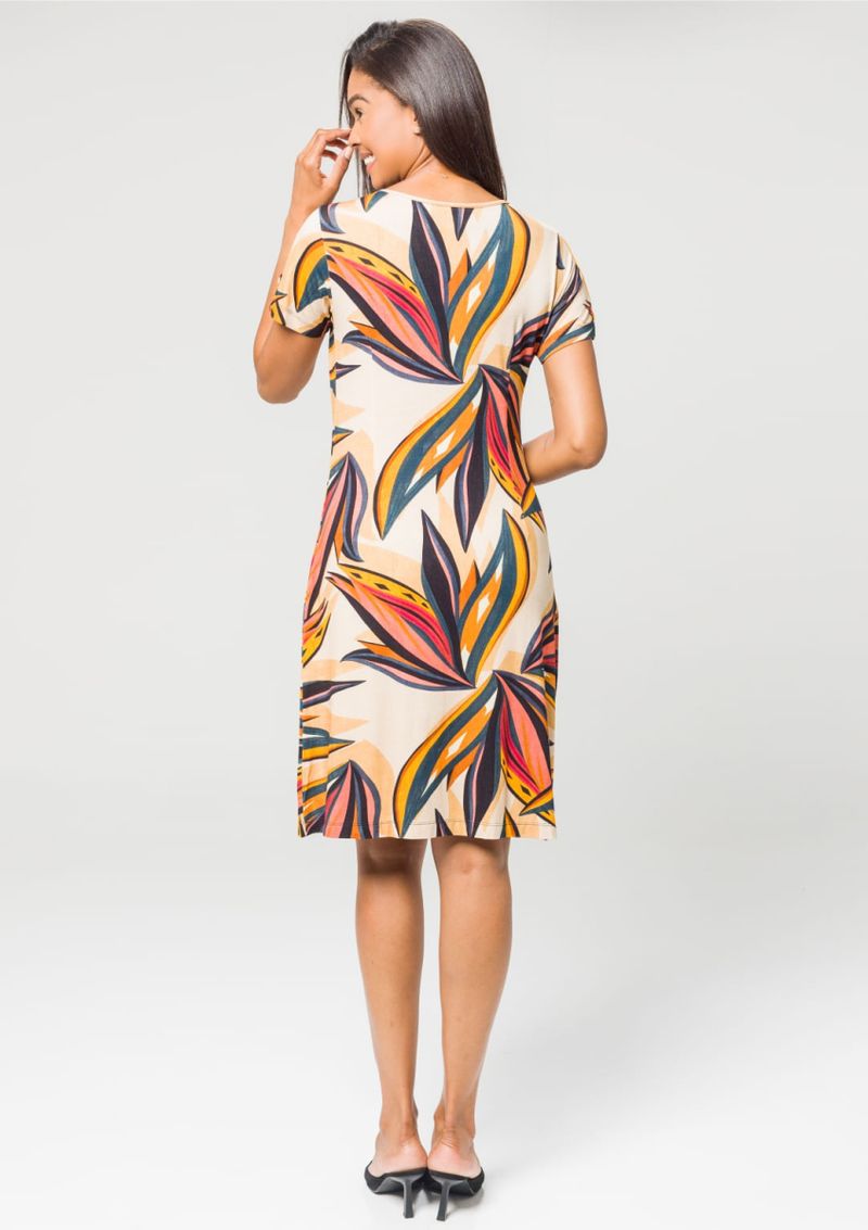 Vestido estampado com decote em "V". Mangas curtas com recorte e passador em malha lisa amarelo, martingale na cor preto e botão. Malha estampada em diversos tons, sobre o fundo Bege. Modelagem soltinha ao corpo. Confortável, elegante e lindo. Composição da malha: Confeccionado em 96% Viscose e 4% Elastano. Construído em "Viscolycra" com toque macio. Medidas Aproximadas: P: 97cm Comprimento x 92cm Busto x 86cm Cintura x 106cm Quadril. M: 99cm Comprimento x 98cm Busto x 92cm Cintura x 112cm Quadril. G: 101cm Comprimento x 104cm Busto x 98cm Cintura x 118cm Quadril. GG: 103cm Comprimento x 110cm Busto x 104cm Cintura x 124cm Quadril. XL: 105cm Comprimento x 116cm Busto x 110cm Cintura x 130cm Quadril. Todos os dados informados são aproximados, do peso às medidas. ATENÇÃO PARA AS MEDIDAS, POIS NOSSA MODELAGEM É AMPLA!