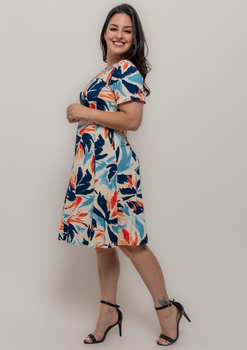 Vestido modelo evasê, com decote em "V". Mangas curtas, compostas por elástico. Malha estampada com predominância nos tons Azul sobre o fundo Bege. Modelagem soltinha ao corpo. Elegante, confortável e lindo! Arrase!!! Composição da Malha: Confeccionado em 96% Viscose e 4% Elastano. Construído em "Viscolycra" com toque macio. Medidas Aproximadas: P: 97 x 88 x 82 x 100 cm (Comprimento, Busto, Cintura e Quadril). M: 99 x 94 x 88 x 106 cm (Comprimento, Busto, Cintura e Quadril). G: 101 x 100 x 94 x 112 cm (Comprimento, Busto, Cintura e Quadril). GG: 103 x 106 x 100 x 118 cm (Comprimento, Busto, Cintura e Quadril). XL: 105 x 112 x 106 x 124 cm (Comprimento, Busto, Cintura e Quadril). Todos os dados informados são aproximados, do peso às medidas. ATENÇÃO PARA AS MEDIDAS. MODELAGEM AMPLA.