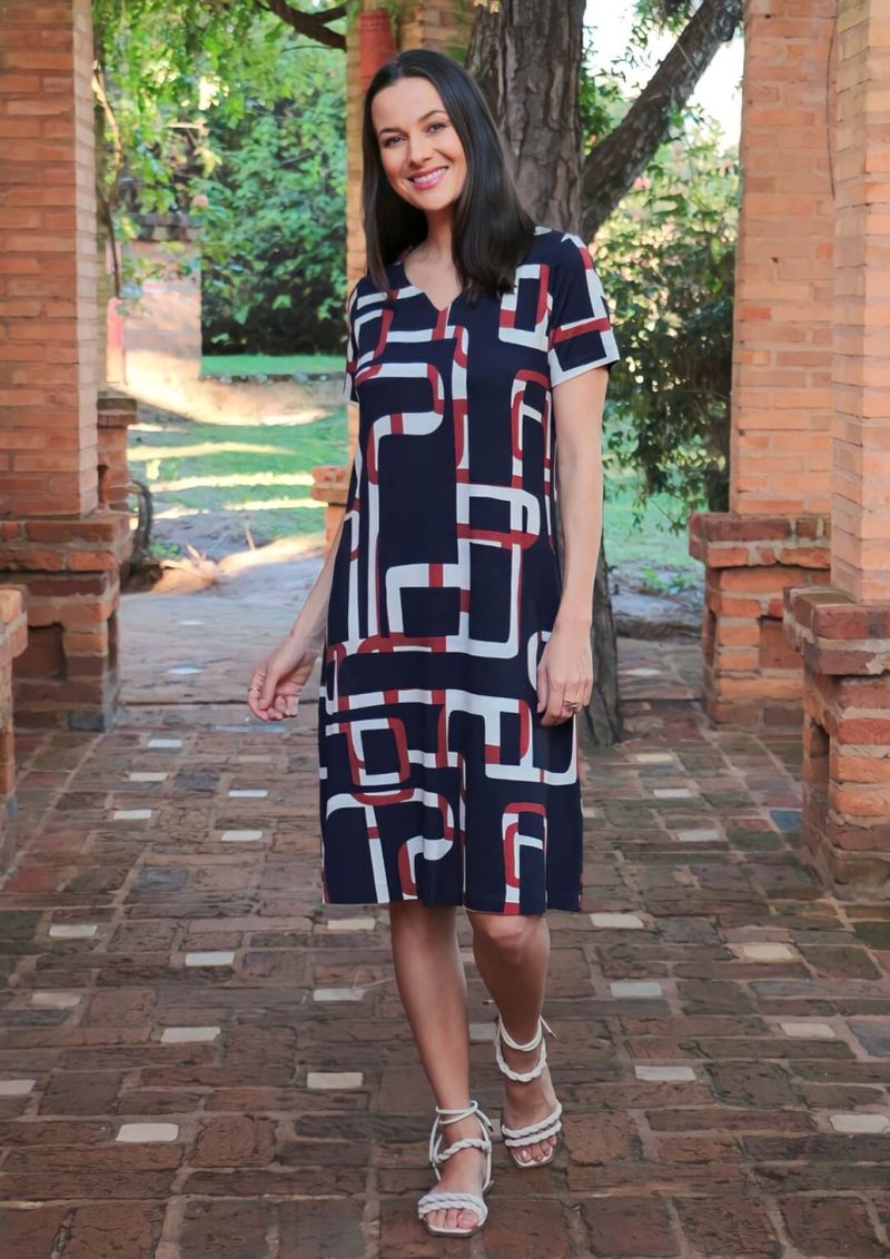 Vestido com decote princesa e mangas curtas. Estampado em Vermelho e Off White sobre o fundo Azul Marinho. Modelo em Viscocrepe, tecido de excelente qualidade e alta durabilidade. É confortável, macio, leve com ótima capacidade de absorção. Permita-se!!! Composição da malha: Confeccionado em Viscocrepe 96% Viscose e 4% Elastano. Medidas Aproximadas: PP: 92cm Comprimento x 88cm Busto x 82cm Cintura x 100cm Quadril. P: 94cm Comprimento x 94cm Busto x 88cm Cintura x 106cm Quadril. M: 96cm Comprimento x 100cm Busto x 94cm Cintura x 112cm Quadril. G: 98cm Comprimento x 106cm Busto x 100cm Cintura x 118cm Quadril. GG: 100cm Comprimento x 112cm Busto x 106cm Cintura x 124cm Quadril. XL: 102cm Comprimento x 118cm Busto x 112cm Cintura x 130cm Quadril. Todos os dados informados são aproximados, do peso às medidas. ATENÇÃO PARA AS MEDIDAS, POIS NOSSA MODELAGEM É AMPLA!