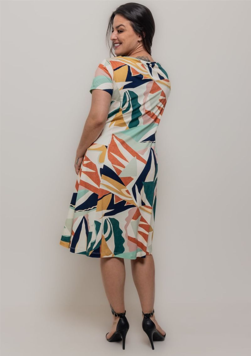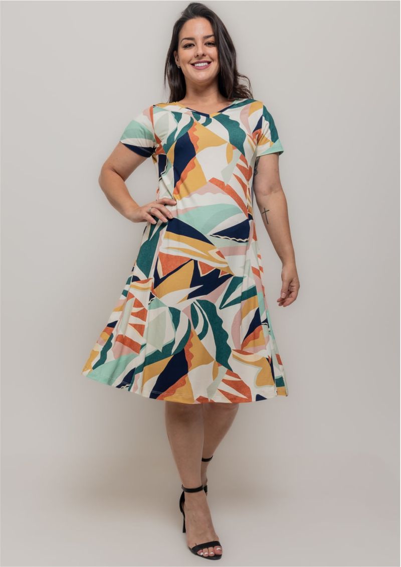 Vestido com recortes, decote em "V" e mangas curtas. Malha estampada, com predominância da cor Verde, sobre o fundo Off White, . Modelagem soltinha ao corpo. Confortável e elegante. Permita-se! Composição da Malha: Confeccionado em 96% Viscose e 4% Elastano. Construído em "Viscocrepe" com toque macio. Medidas Aproximadas: PP: 95 x 90 x 84 x 102 cm (Comprimento, Busto, Cintura e Quadril). P: 97 x 96 x 90 x 108 cm (Comprimento, Busto, Cintura e Quadril). M: 99 x 102 x 96 x 114 cm (Comprimento, Busto, Cintura e Quadril). G: 101 x 108 x 102 x 120 cm (Comprimento, Busto, Cintura e Quadril). GG: 103 x 114 x 108 x 126 cm (Comprimento, Busto, Cintura e Quadril). XL: 105 x 120 x 114 x 132 cm (Comprimento, Busto, Cintura e Quadril). Todos os dados informados são aproximados, do peso às medidas. ATENÇÃO PARA AS MEDIDAS, POIS NOSSA MODELAGEM É AMPLA.