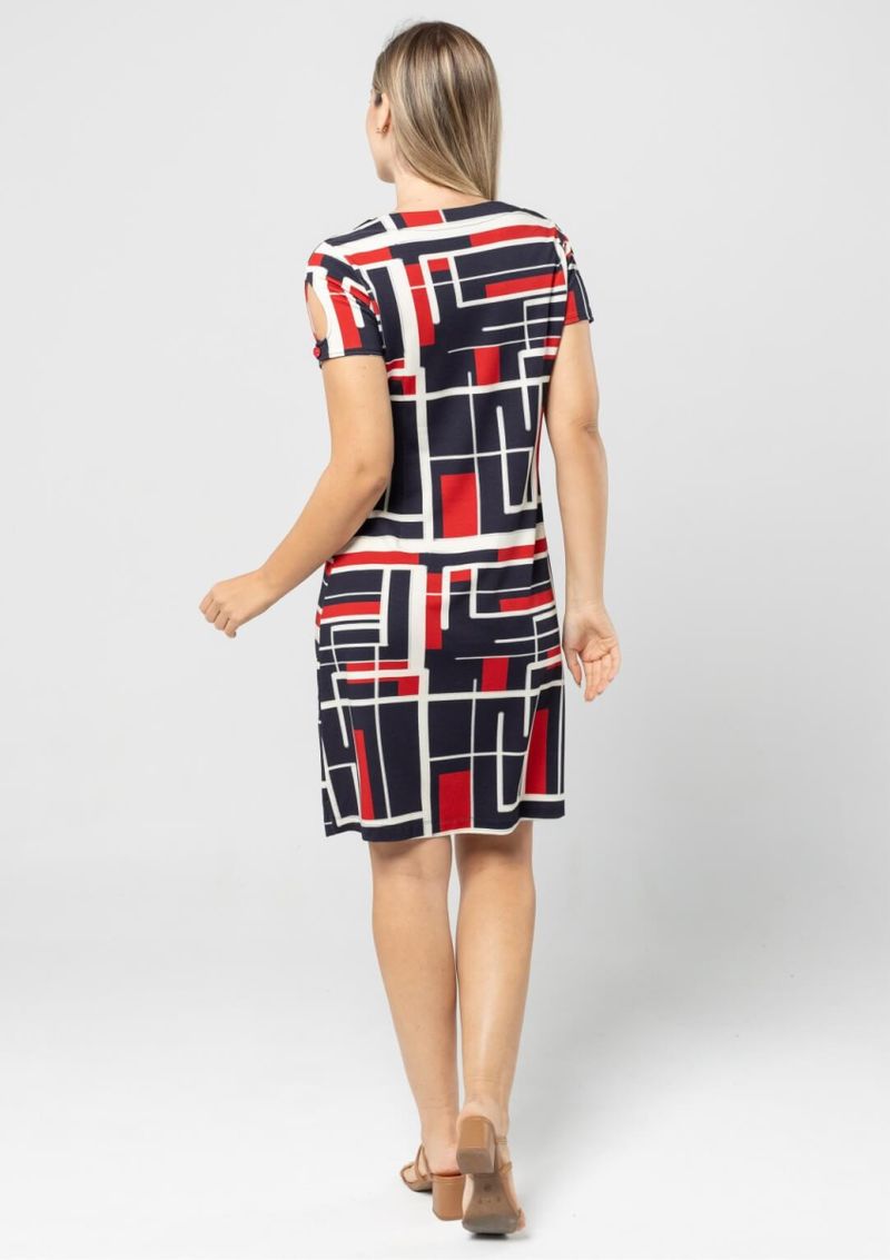 Vestido com manga curta e decote em "V". Modelo estampado em Azul Marinho, Vermelho e Off White. Mangas possuem detalhe de abertura e botão na cor Vermelho. Modelo em tecido de moletinho, com caimento levemente estruturado, maleável com toque macio e confortável. Vestido super moderno e feminino, garante já o seu!!! Composição da malha: Confeccionado em 97% Viscose e 3% Elastano. Medidas Aproximadas: PP: 96cm Comprimento x 92cm Busto x 90m Cintura x 106cm Quadril. P: 98cm Comprimento x 98cm Busto x 96cm Cintura x 112cm Quadril. m: 100cm Comprimento x 104cm Busto x 102cm Cintura x 118cm Quadril. G: 102cm Comprimento x 110cm Busto x 108cm Cintura x 124cm Quadril. GG: 104cm Comprimento x 116cm Busto x 114cm Cintura x 130cm Quadril. XL: 106cm Comprimento x 122cm Busto x 120cm Cintura x 136cm Quadril. Todos os dados informados são aproximados, do peso às medidas. ATENÇÃO PARA AS MEDIDAS, POIS NOSSA MODELAGEM É AMPLA! *Modelo está usando o tamanho P*