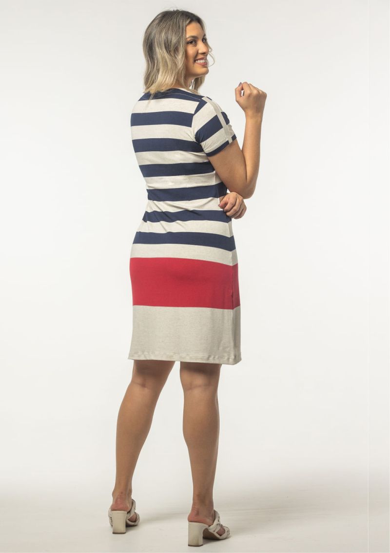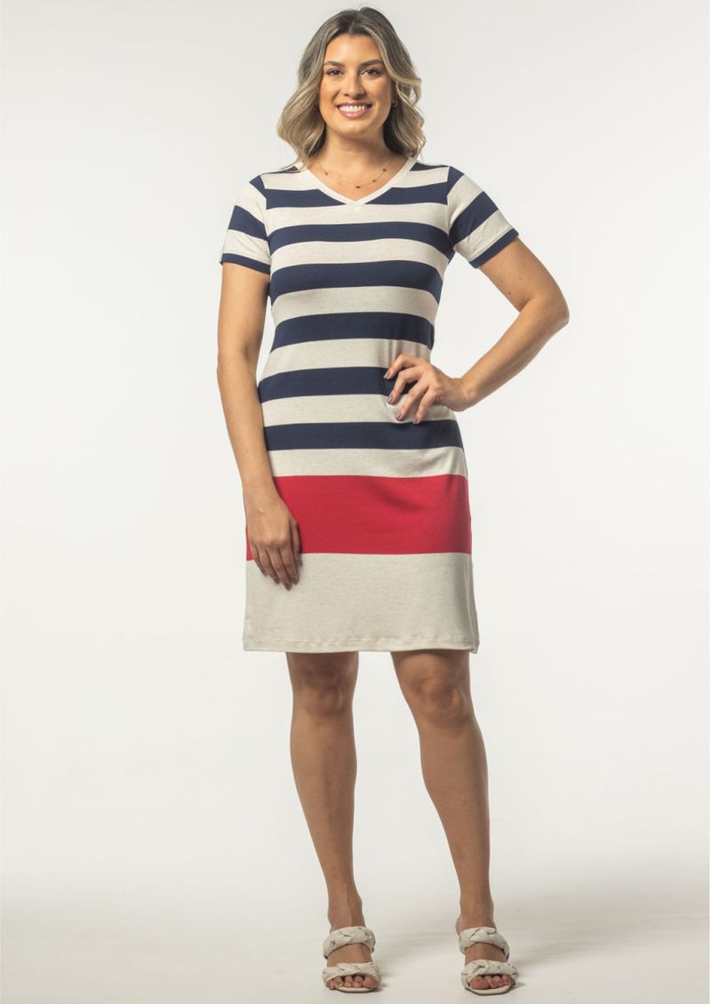 Vestido com decote em "V" e Mangas Curtas com recorte. Vestido em malha listrada na Marinho, Vermelho e Cru. Confortável e elegante, compõem looks despojados. Arrase! Composição da Malha: Confeccionado em 95% Viscose e 5% Elastano. Construído em "Viscocrepe" com toque macio. Medidas Aproximadas: P: 97 x 92 x 88 x 104 cm (Comprimento, Busto, Cintura e Quadril). M: 99 x 98 x 94 x 110 cm (Comprimento, Busto, Cintura e Quadril). G: 101 x 104 x 100 x 116 cm (Comprimento, Busto, Cintura e Quadril). GG: 103 x 110 x 106 x 122 cm (Comprimento, Busto, Cintura e Quadril). XL: 105 x 116 x 112 x 128 cm (Comprimento, Busto, Cintura e Quadril). Todos os dados informados são aproximados, do peso às medidas. ATENÇÃO PARA AS MEDIDAS, POIS NOSSA MODELAGEM É AMPLA!