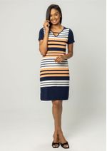 Vestido mangas curtas e decote vazado. Listrado nos tons de Papaia, Azul Marinho e Off White. Tecido viscolycra, ótima elasticidade, leve e com caimento incrível. Modelo listrado, peça atemporal que se adequa a vários estilos. Peça com muita elegância e conforto. Confira!!! Composição da malha: Confeccionado em 95% Viscose e 5% Elastano. Medidas Aproximadas: PP: 95cm Comprimento x 82cm Busto x 80cm Cintura x 96cm Quadril. P: 97cm Comprimento x 88cm Busto x 86cm Cintura x 102cm Quadril. M: 99cm Comprimento x 94cm Busto x 92cm Cintura x 108cm Quadril. G: 101cm Comprimento x 110cm Busto x 98cm Cintura x 114cm Quadril. GG: 103cm Comprimento x 116cm Busto x 104cm Cintura x 120cm Quadril. XL: 105cm Comprimento x 122cm Busto x 110cm Cintura x 126cm Quadril. Todos os dados informados são aproximados, do peso às medidas. ATENÇÃO PARA AS MEDIDAS, POIS NOSSA MODELAGEM É AMPLA!
