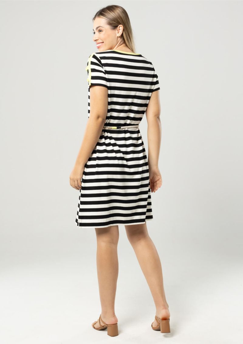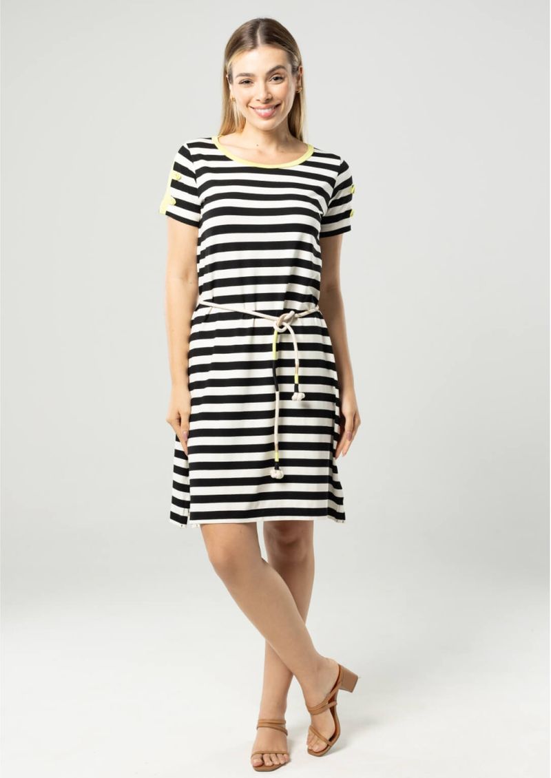 Vestido decote redondo e manga curta. Listrado nas cores Preto e Off White, com acabamento do decote na cor Verde Lima. Mangas possuem recorte e acabamentos de azelha com botões revestidos na cor Verde Lima. Esse modelo acompanha um belo cinto rustico artesanal, na cor Cru com alguns detalhes em Verde Lima, Preto e Bege. Malha Viscolycra , conforto e flexibilidade a quem usa, assim como durabilidade. Modelo para elevar a autoestima de todas as mulheres. Confira!!! Composição da malha: Confeccionado em Viscolycra 96% Viscose e 4% Elastano. Medidas Aproximadas: P: 95cm Comprimento x 96cm Busto x 98cm Cintura x 104cm Quadril. M: 97cm Comprimento x 102cm Busto x 104cm Cintura x 110cm Quadril. G: 99cm Comprimento x 108cm Busto x 110cm Cintura x 116cm Quadril. GG: 101cm Comprimento x 114cm Busto x 116cm Cintura x 122cm Quadril. XL: 103cm Comprimento x 120cm Busto x 122cm Cintura x 128cm Quadril. Todos os dados informados são aproximados, do peso às medidas. ATENÇÃO PARA AS MEDIDAS, POIS NOSSA MODELAGEM É AMPLA! *Modelo está usando o tamanho P*