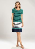 Vestido mangas curtas e decote em "V" com punho duplo. Modelo listrado nos tons de Azul Marinho, Verde e Off White. O tecido em viscolycra tem ótima elasticidade, é leve com um caimento incrível. Modelo solto e despojado. Confira!!! Composição da malha: Confeccionado em 96% Viscose e 4% Elastano. Medidas Aproximadas: P: 95cm Comprimento x 92cm Busto x 88cm Cintura x 100cm Quadril. M: 97cm Comprimento x 98cm Busto x 94cm Cintura x 106cm Quadril. G: 99cm Comprimento x 104cm Busto x 100cm Cintura x 112cm Quadril. GG: 101cm Comprimento x 110cm Busto x 106cm Cintura x 118cm Quadril. XL: 103cm Comprimento x 116cm Busto x 112cm Cintura x 124cm Quadril. Todos os dados informados são aproximados, do peso às medidas. ATENÇÃO PARA AS MEDIDAS, POIS NOSSA MODELAGEM É AMPLA!