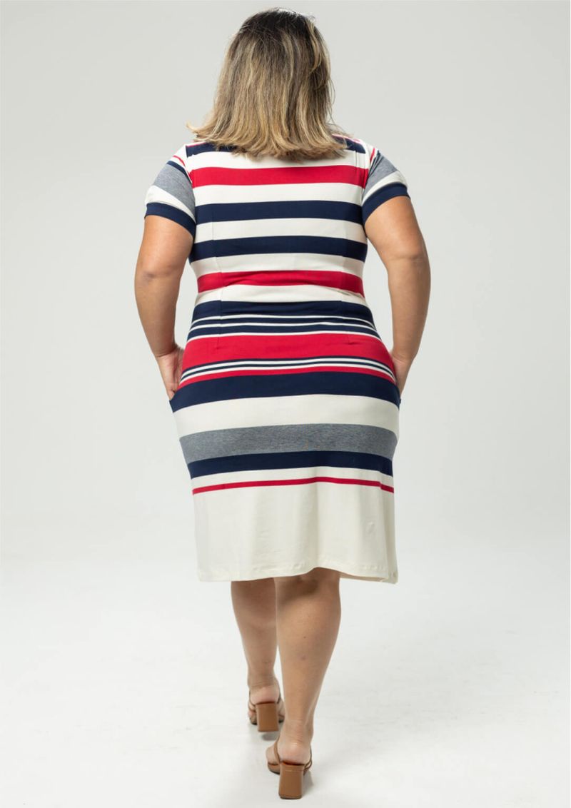 Vestido mangas curtas e decote em "V" transpassado. Listrado nos tons de Azul Marinho, Off White e Vermelho. Possui bolsos laterais que trás um ar mais despojado a peça. Mangas e decote com acabamento em punho na cor Azul Marinho. Confeccionado em Viscolycra: tecido com alta elasticidade. Leve, macio, confortável e seu caimento se molda facilmente ao corpo. Modelo com muita personalidade. Confira!!! Composição da malha: 95% Viscose e 5% Elastano. Medidas Aproximadas: P: 97cm Comprimento x 90cm Busto x 86cm Cintura x 100cm Quadril. M: 99cm Comprimento x 96cm Busto x 92cm Cintura x 106cm Quadril. G: 101cm Comprimento x 102cm Busto x 98cm Cintura x 112cm Quadril. GG: 103cm Comprimento x 108cm Busto x 104cm Cintura x 118cm Quadril. XL: 105cm Comprimento x 114cm Busto x 110cm Cintura x 124cm Quadril. Todos os dados informados são aproximados, do peso às medidas. ATENÇÃO PARA AS MEDIDAS, POIS NOSSA MODELAGEM É AMPLA!