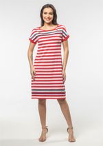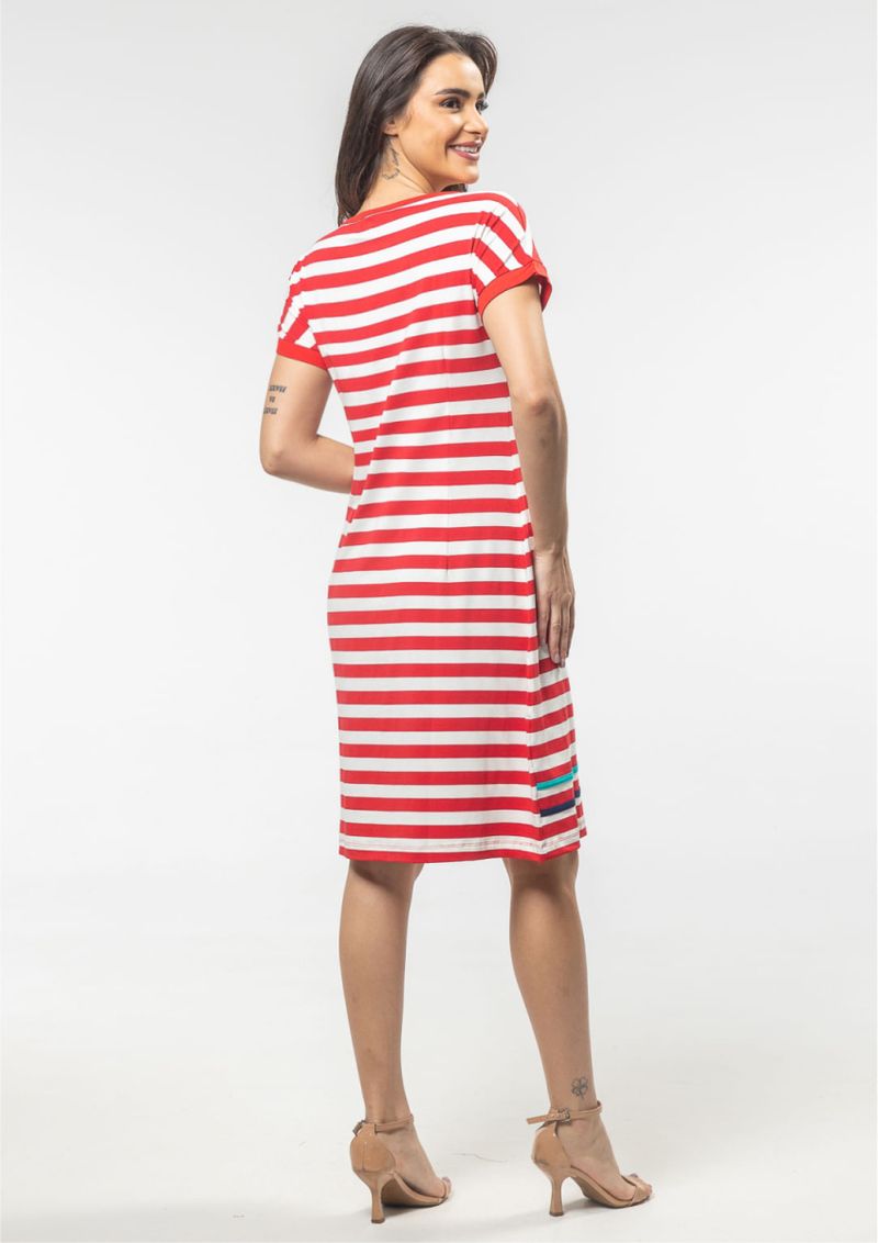 Vestido listrado Vermelho e Branco, confeccionado em viscolycra ideal para o dia a dia. Possui mangas japonesas com acabamento em punho Vermelho. Decote redondo e listras frontais sobrepostas a malha, nas cores Azul Claro e Azul Marinho. Look para todos os estilos, versátil e confortável. Composição da Malha: Confeccionado em 96% Viscose e 4% Elastano. Construído em "Viscolycra" com toque macio. Medidas Aproximadas: P: 100cm Comprimento x 98cm Busto x 88cm Cintura x 104cm Quadril. M: 101cm Comprimento x 104cm Busto x 94cm Cintura x 110cm Quadril. G: 102cm Comprimento x 106cm Busto x 100cm Cintura x 112cm Quadril. GG: 103cm Comprimento x 112cm Busto x 108cm Cintura x 124cm Quadril. XL: 106cm Comprimento x 124cm Busto x 114cm Cintura x 128cm Quadril. Todos os dados informados são aproximados, do peso às medidas. ATENÇÃO PARA AS MEDIDAS. MODELAGEM AMPLA.