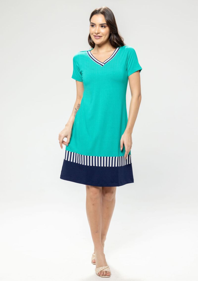 Vestido com mangas curtas e um lindo decote em "V" em malha listrada. Construída em "Viscolycra" lisa - Verde. Possui recortes no barrado em malha listrada Azul Marinho e Off White. Modelagem soltinha ao corpo. Conforto com Elegância! Permita-se! Composição da malha: Confeccionado em 96% Viscose e 4% Elastano. Medidas Aproximadas: P: 95cm Comprimento x 92cm Busto x 90cm Cintura x 104cm Quadril. M: 97cm Comprimento x 98cm Busto x 96cm Cintura x 110cm Quadril. G: 99cm Comprimento x 104cm Busto x 102cm Cintura x 116cm Quadril. GG: 101cm Comprimento x 110cm Busto x 108cm Cintura x 122cm Quadril. XL: 103cm Comprimento x 116cm Busto x 114cm Cintura x 128cm Quadril. Todos os dados informados são aproximados, do peso às medidas. ATENÇÃO PARA AS MEDIDAS. MODELAGEM AMPLA.