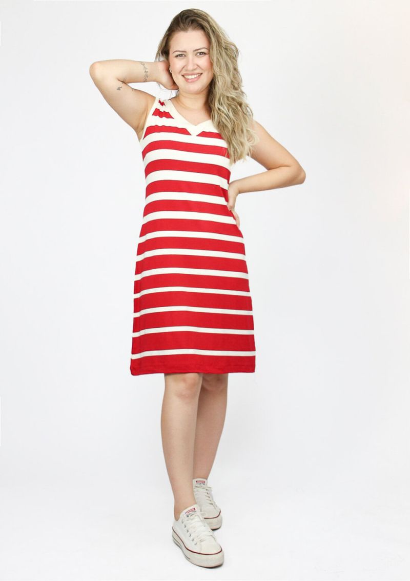 Vestido Regata Listrado Vermelho e Off White - Conforto e estilo para todas as ocasiões. Listras horizontais nas cores Vermelho e off white, criando um efeito visual estiloso e versátil. Alças largas que garantem maior conforto e suporte, proporcionando um ajuste perfeito. Decote "princesa" que valoriza a silhueta e dá um toque de elegância ao modelo. Acabamento do decote e das cavas em off white, detalhando a peça com sofisticação e equilíbrio. Ideal para todas as horas desde um passeio casual até um evento mais descontraído. Permita-se! Composição do Tecido Viscolycra: 92% Viscose e 8% Elastano: O tecido é leve, macio e com excelente elasticidade, proporcionando conforto e um caimento perfeito ao corpo. A viscose garante frescor, enquanto o elastano oferece liberdade de movimento. Medidas Aproximadas: •PP: Comprimento 94 cm | Busto 86 cm | Cintura 84 cm | Quadril 100 cm •P: Comprimento 96 cm | Busto 92 cm | Cintura 90 cm | Quadril 106 cm •M: Comprimento 98 cm | Busto 98 cm | Cintura 96 cm | Quadril 112 cm •G: Comprimento 100 cm | Busto 104 cm | Cintura 102 cm | Quadril 118 cm •GG: Comprimento 102 cm | Busto 110 cm | Cintura 108 cm | Quadril 124 cm •XL: Comprimento 104 cm | Busto 116 cm | Cintura 114 cm | Quadril 130 cm •Detalhes Importantes: Modelagem ampla, oferecendo liberdade e conforto durante o uso. Medidas aproximadas para ajudar na escolha do tamanho ideal. A modelo na imagem está usando o tamanho P.