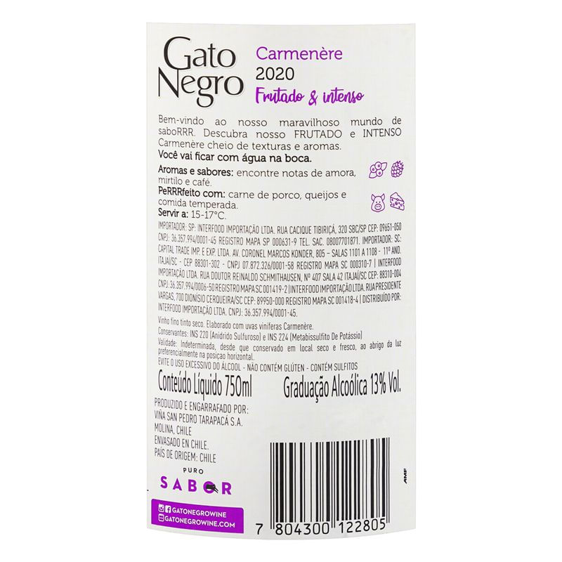 Você está comprando: VINHO GATO NEGRO CARMENERE TINTO 750MLPaís de Origem: CHILEValidade: IndeterminadoSOBRE O PRODUTO: Elegante, frutado e versátil, o Vinho Gato Negro Carmenère é uma ótima opção para quem valoriza um bom vinho, com tradição, originalidade e altíssima qualidade. Elaborado em renomadas vinícolas Chilenas, com terroirs férteis de clima ideal, é um tinto levemente encorpado, que apresenta sabores ressaltados de frutas, como amora e cassis, em harmonia com notas de baunilha, toques de tabaco e especiarias, conquistando reconhecimento no Chile e no exterior, gerando ao paladar uma sensação frutada e macia. Prove com aperitivos, massas, carnes de caça, legumes grelhados, culinária oriental e queijos médios. Ficha Técnica Tipo: Tinto e Seco Uva: 95% Carmenère e 5% Syrah Região: Vale Central Teor Alcoólico: 13% Amadurecimento: Curto estágio em barricas de carvalho. Temperatura ideal: 15°C a 17°C Visual: Violáceo Intenso. Aroma: Notas de amora, cassis, especiarias, baunilha e tabaco. Paladar: Frutado e macio. Corpo: Médio. UVA Carmenère REGIÃO Vale Central VOLUME 750ml MARCA San Pedro AMADURECIMENTO Curto Estágios Em Barricas De Carvalho VISUAL Violáceo Intenso OLFATIVO Notas De Amora, Cassis, Especiarias E Baunilha NA BOCA Médio Corpo. Frutado E Macio GASTRONOMIA Risotos, Massas E Pizzas VINÍCOLA San Pedro Com quase 150 anos de tradição, a Viña San Pedro foi fundada em 1865, no Vale do Curicó-Chile, pelos irmãos Correa Albano. A Vinícola desempenhou um papel muito importante na indústria vitivinícola na busca por novos “terroirs”, na produção de vinhos originais e de alta qualidade, o que garantiu a satisfação dos paladares mais exigentes no mundo. Em 1940 iniciaram suas atividades de exportação para EUA, Canadá, Alemanha e Japão. Hoje considerada a 3ª maior exportadora de vinhos do Chile; detêm 22,5% do mercado interno (market share) e está presente em mais de 80 países.
