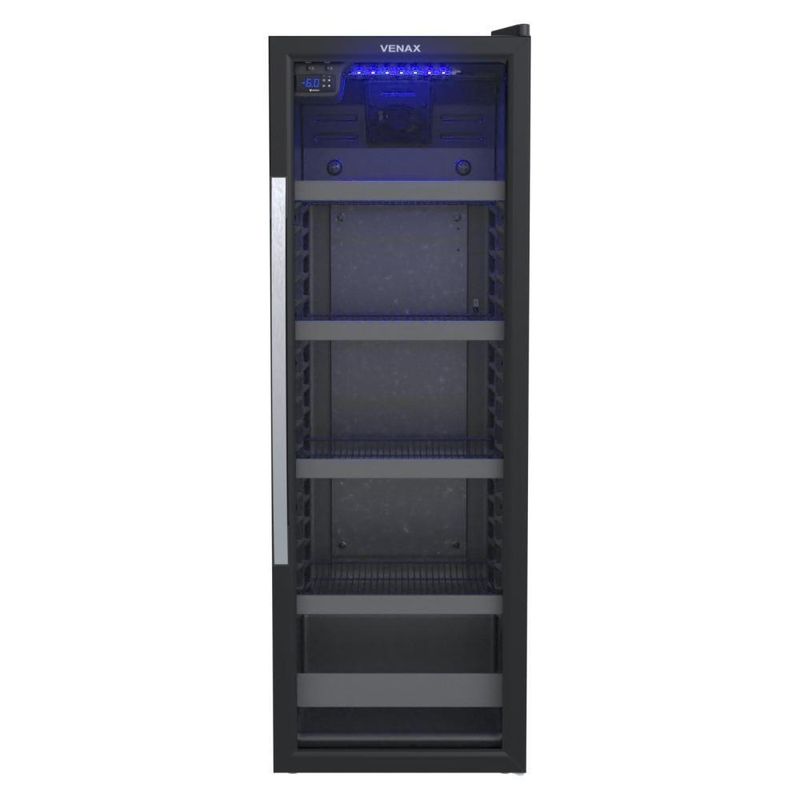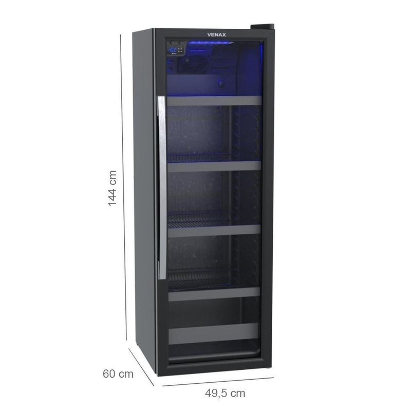 Visa Cooler Expositor Cervejeiro Porta Vidro 200l Blue Light Expvqbl 200 - Venax Preto Fosco 220vVisa Cooler Expositor Cervejeiro Porta Vidro 200L Blue Light Expvqbl 200 - Venax Preto FoscoCARACTERÍSTICAS e Descrição Ficha Técnica:- Controlador de Temperatura: Digital, Regulável 0°C à -6°C - Iluminação Interna: LED Azul - Porta: Vidro Duplo - Aquecimento da Porta: Sim - Puxador da Porta: Alumínio- Trava de Abastecimento: Não - Gás Refrigerante: R134a - Degelo: Automático - Dreno: Traseiro - Recipiente de Degelo: Sim - Prateleiras: 4 Reguláveis - Evaporador: Ar Forçado - Sistema de Refrigeração: Compressor - Pés: Frontais Reguláveis e Traseiros com Rolete - Gabinete Interno: PSAI - Gabinete Externo: Aço Revestido com Pintura Eletrostática - Testeira: Não - Cor Interna: Preto - Cor Externa: Preto Fosco- Tensão: 127 V ou 220 V - Frequência: 60Hz - Isolamento Térmico: Poliuretano - Etiquetas: Selo de Segurança - Garantia: 1 Ano - Potência: 200W - Peso Liquido: 55Kg - Peso Bruto: 61 Kg - Medidas Externas: 144cm Alt x 49,5cm Lar. X 60cm Prof.- Medidas Internas: 128cm A x 39,5cm L x 36cm P. - Medidas Externas Embalada: 152cm Alt x 54cm Lar. X 63cm Prof.Capacidade de Armazenamento: - Lata 350ml: 204 un. - 473ml: 148 un. - Longneck 355ml: 108 un. - Garrafa 600ml: 71 un. - Garrafa 1L: 40 un. - Garantia: 12 meses contra defeito de fabricação. Capacidade em volume: 200 Voltagem: 220V